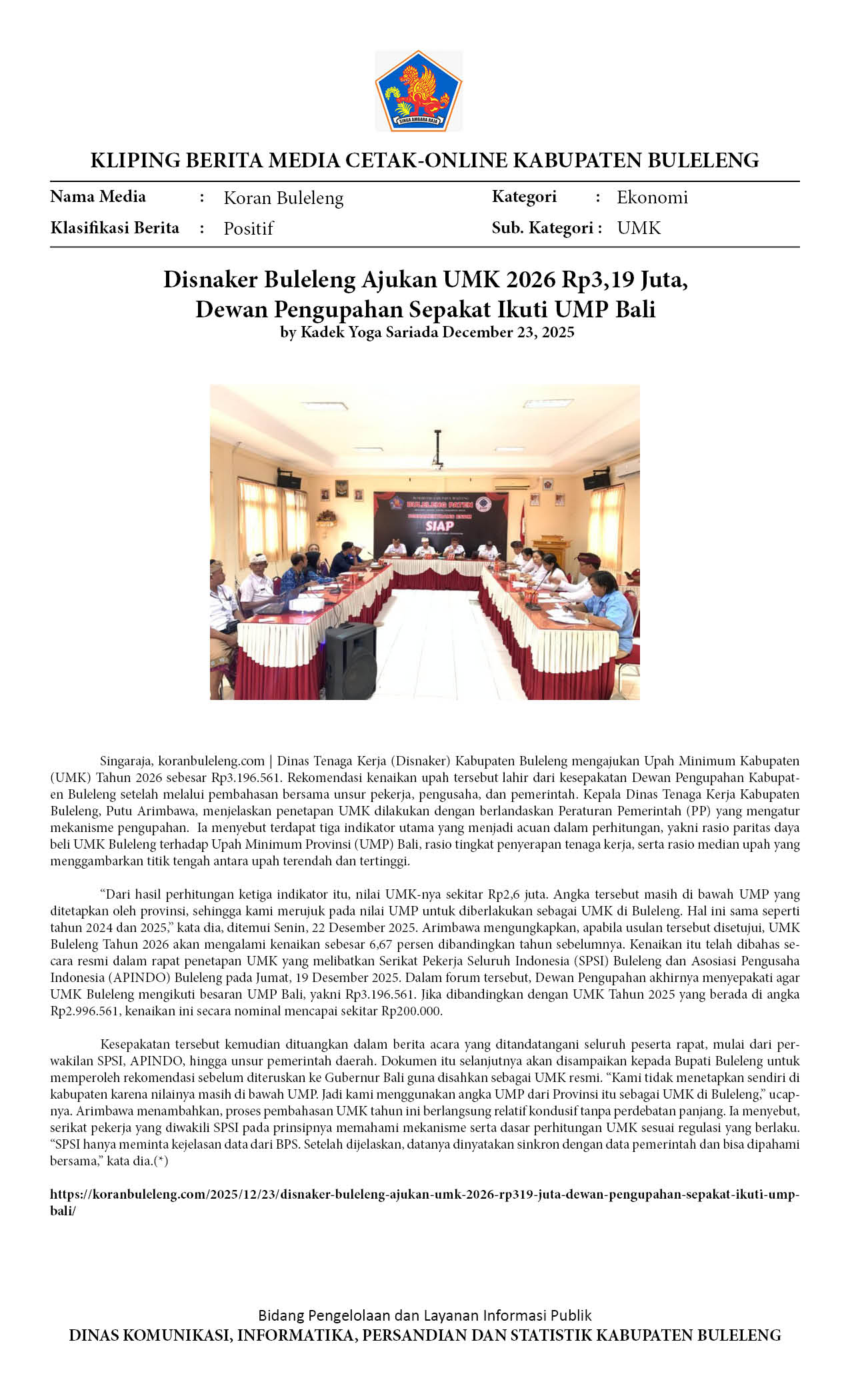 DISNAKER BULELENG AJUKAN UMK 2026 RP3,19 JUTA, DEWAN PENGUPAHAN SEPAKAT IKUTI UMP BALI