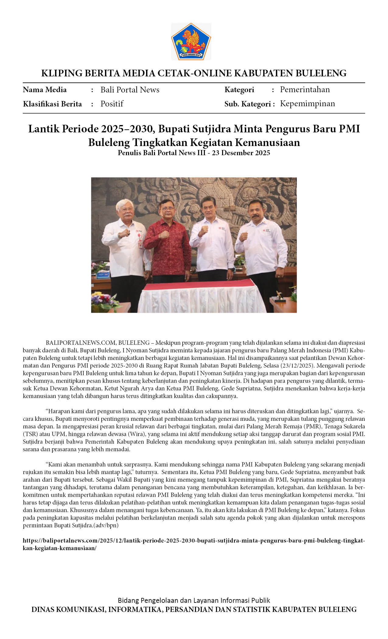 LANTIK PERIODE 2025–2030, BUPATI SUTJIDRA MINTA PENGURUS BARU PMI BULELENG TINGKATKAN KEGIATAN KEMANUSIAAN