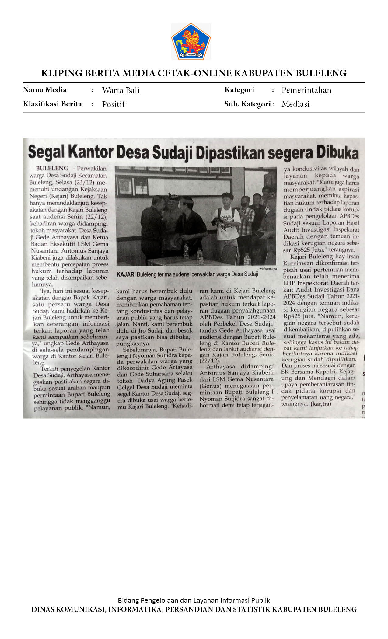 PROSES HUKUM DUGAAN KORUPSI DESA SUDAJI DIPASTIKAN TETAP BERJALAN