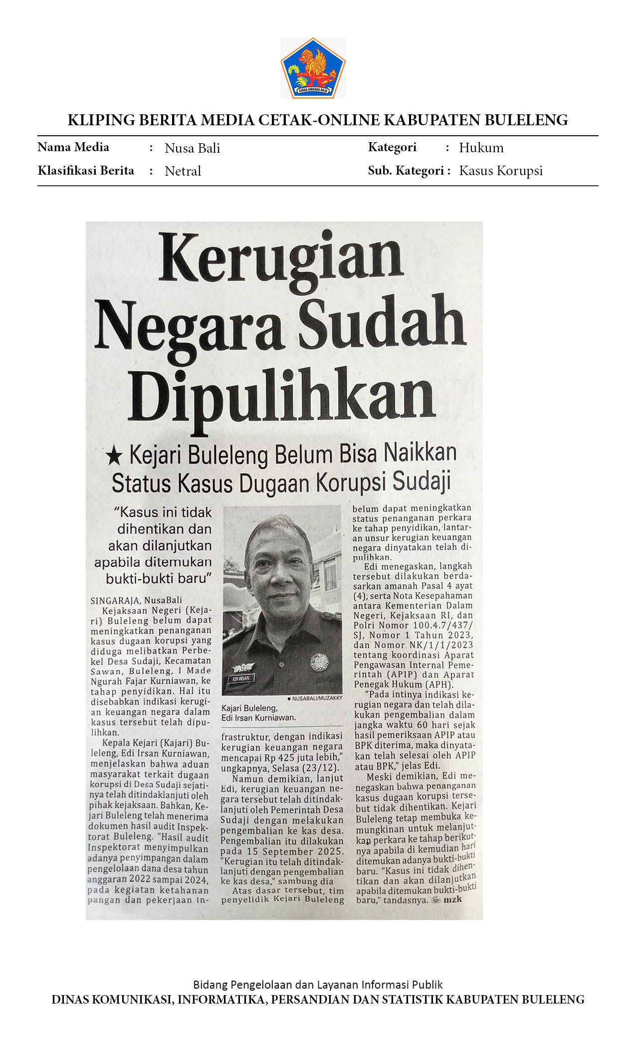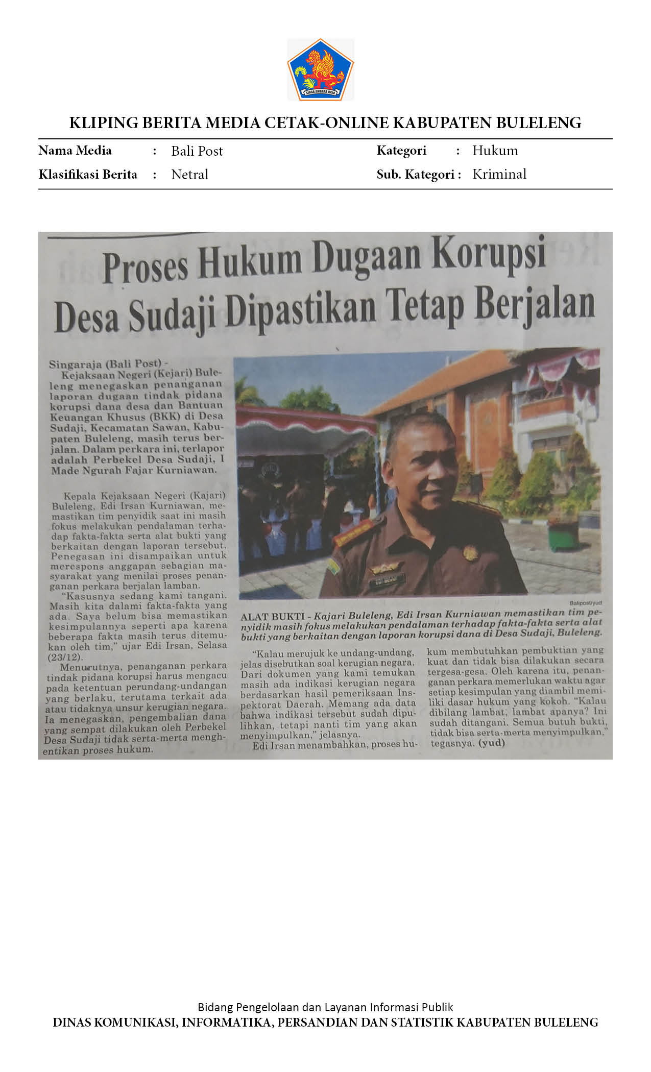 PROSES HUKUM DUGAAN KORUPSI DESA SUDAJI DIPASTIKAN TETAP BERJALAN