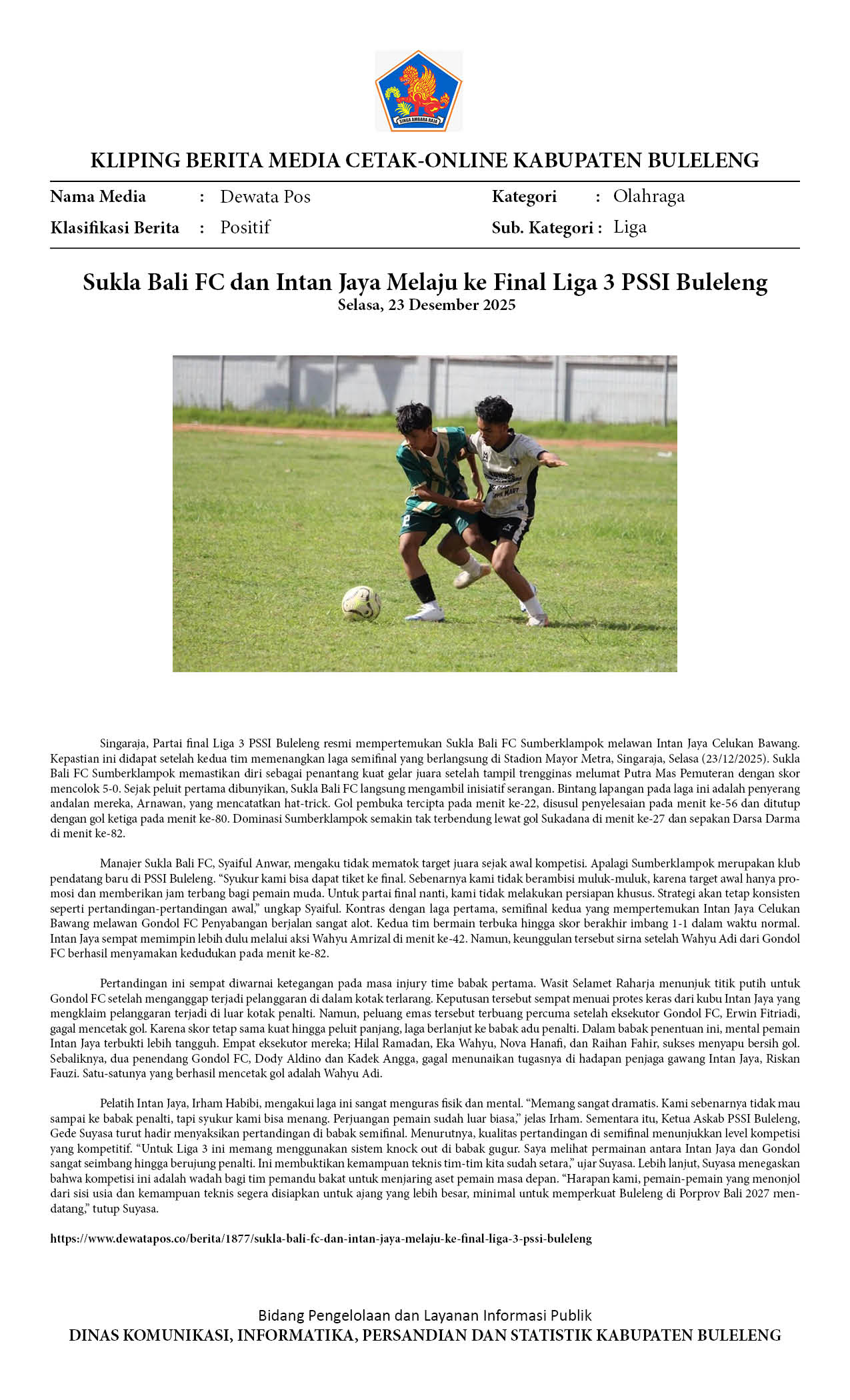 SUKLA BALI FC DAN INTAN JAYA MELAJU KE FINAL LIGA 3 PSSI BULELENG