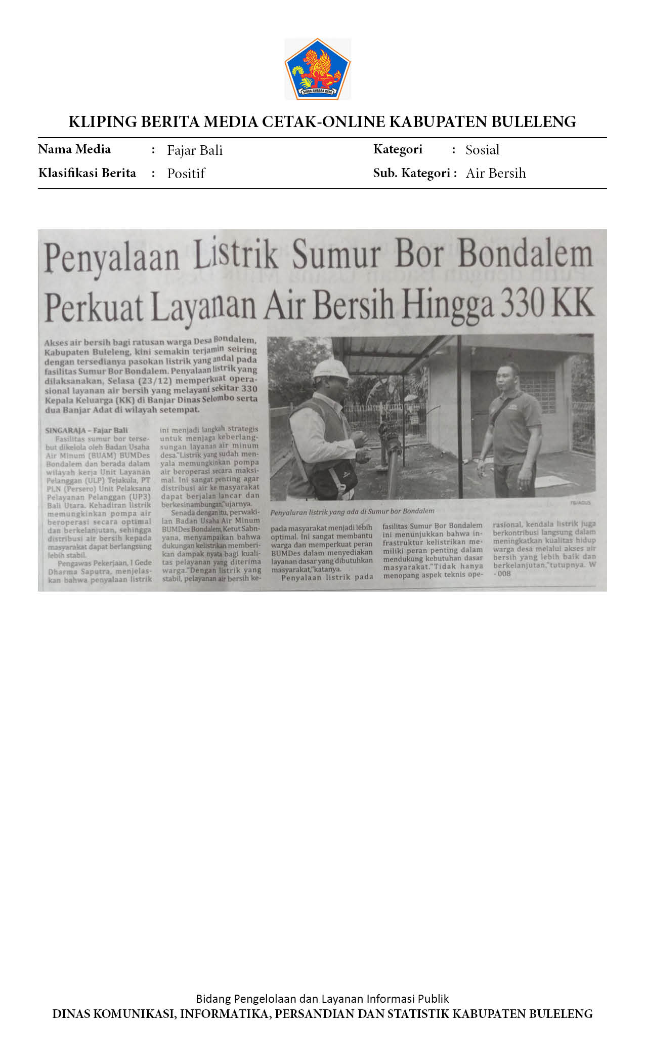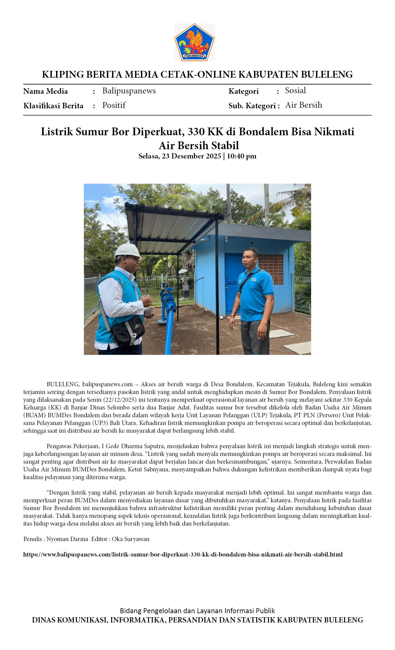 LISTRIK SUMUR BOR DIPERKUAT, 330 KK DI BONDALEM BISA NIKMATI AIR BERSIH STABIL