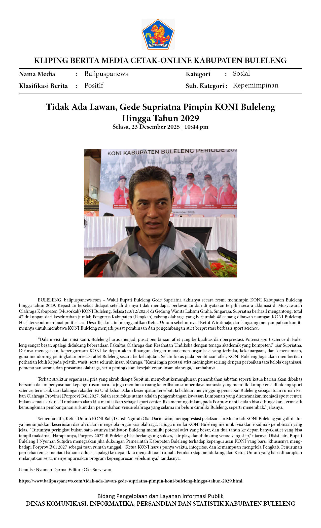 TIDAK ADA LAWAN, GEDE SUPRIATNA PIMPIN KONI BULELENG HINGGA TAHUN 2029