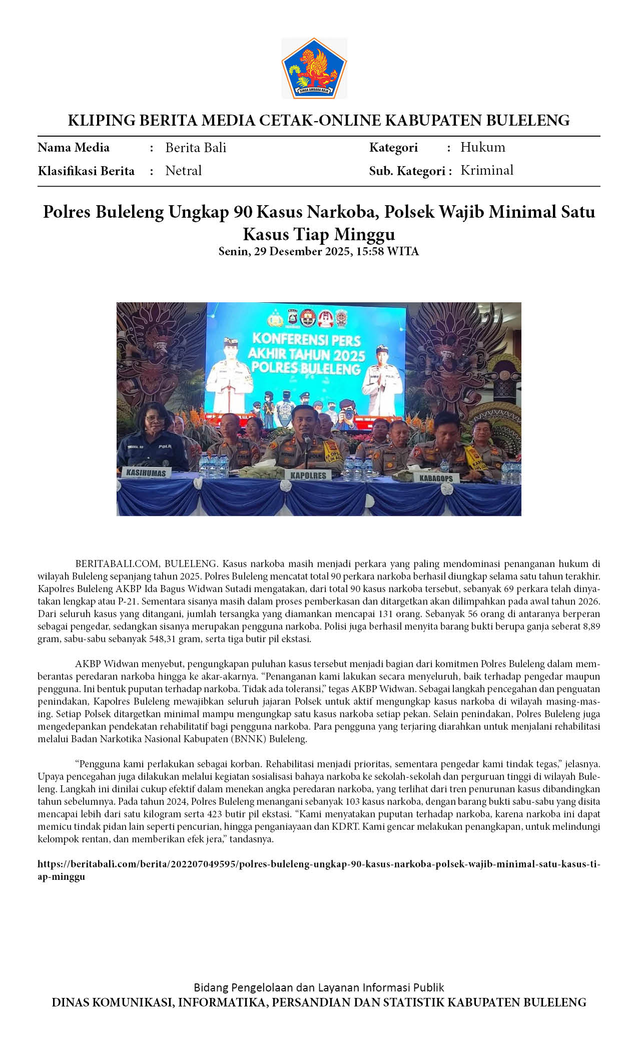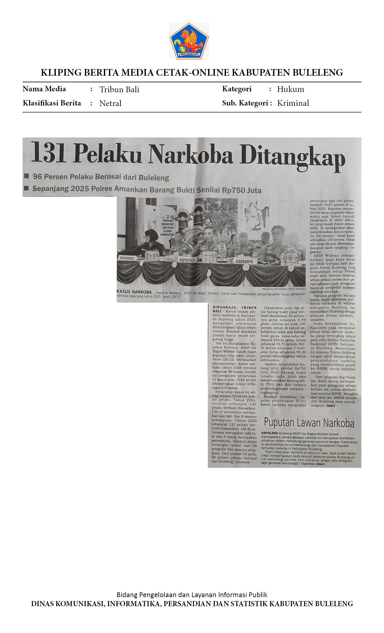 DIBANDING 2024, KASUS NARKOTIKA PADA 2025 DI BULELENG MENURUN