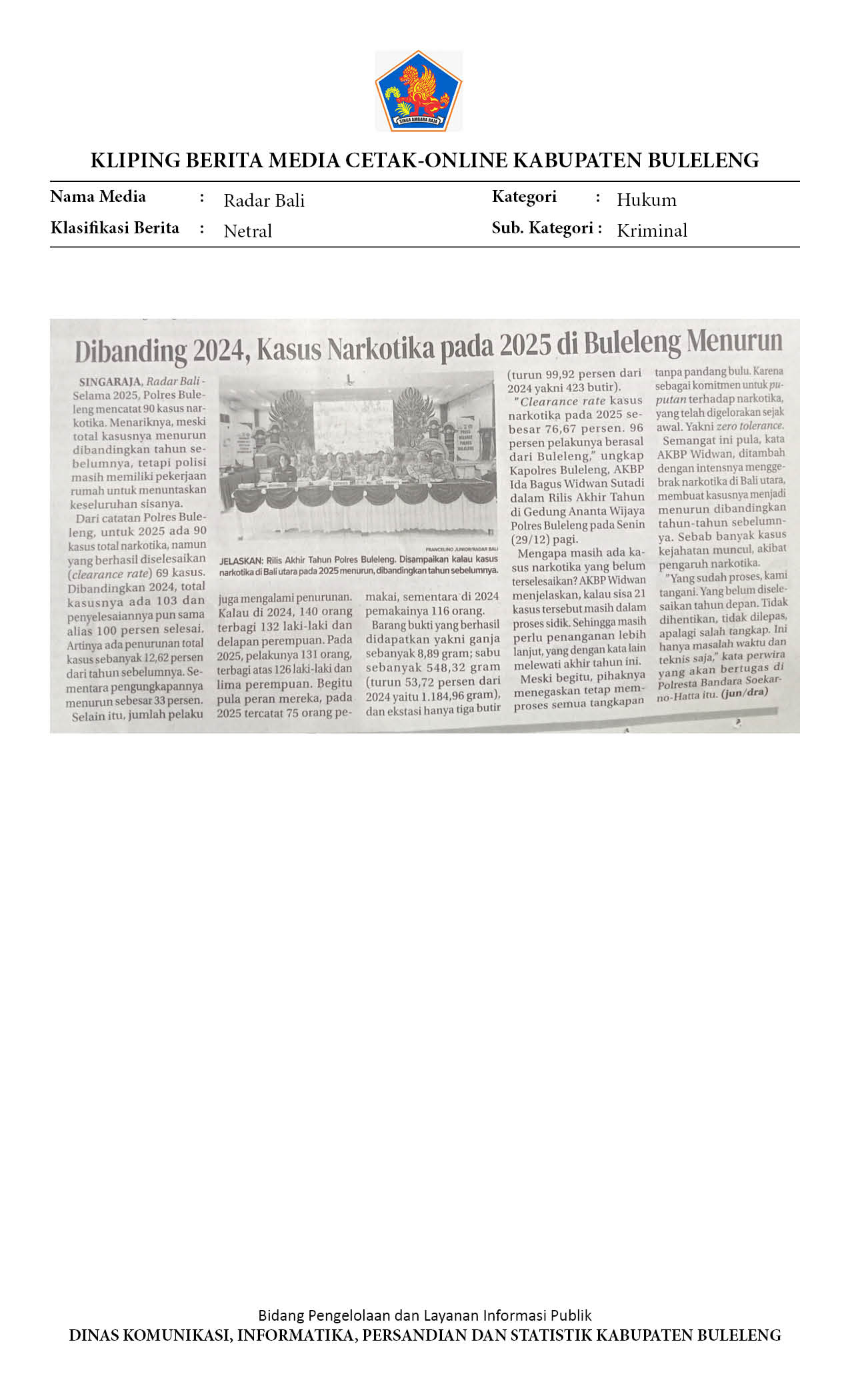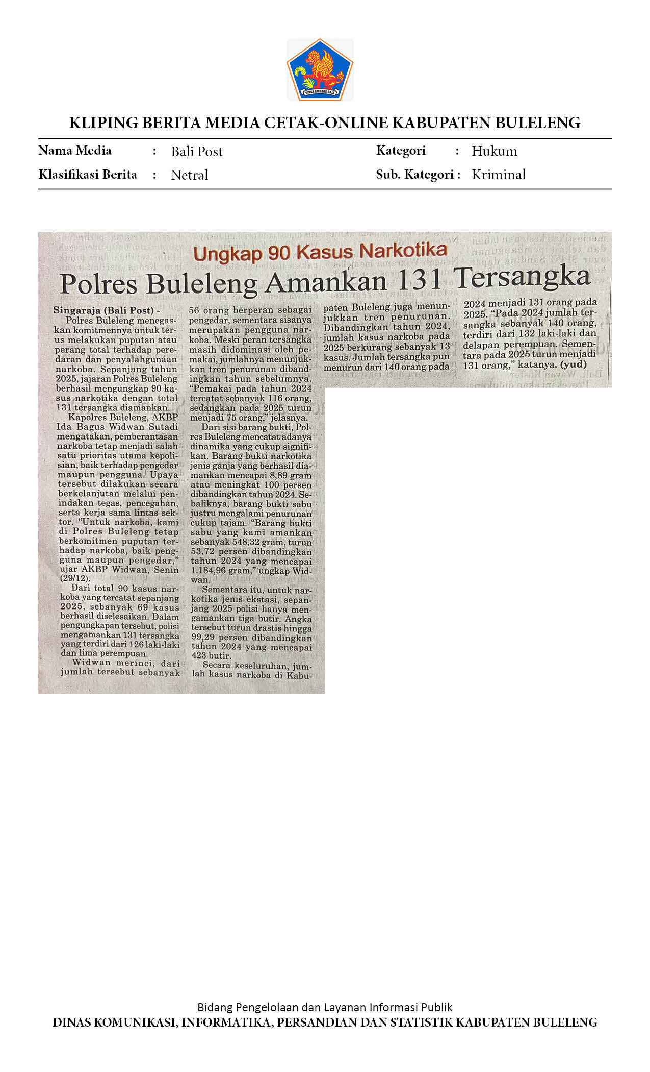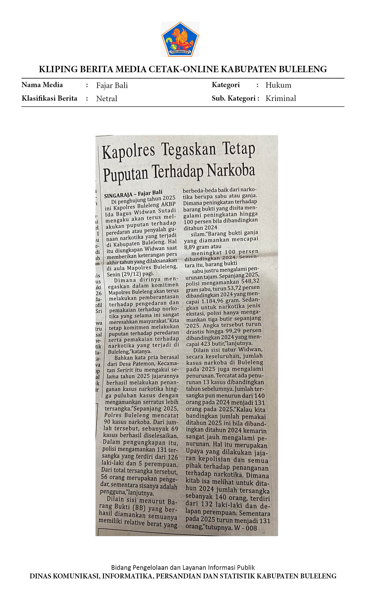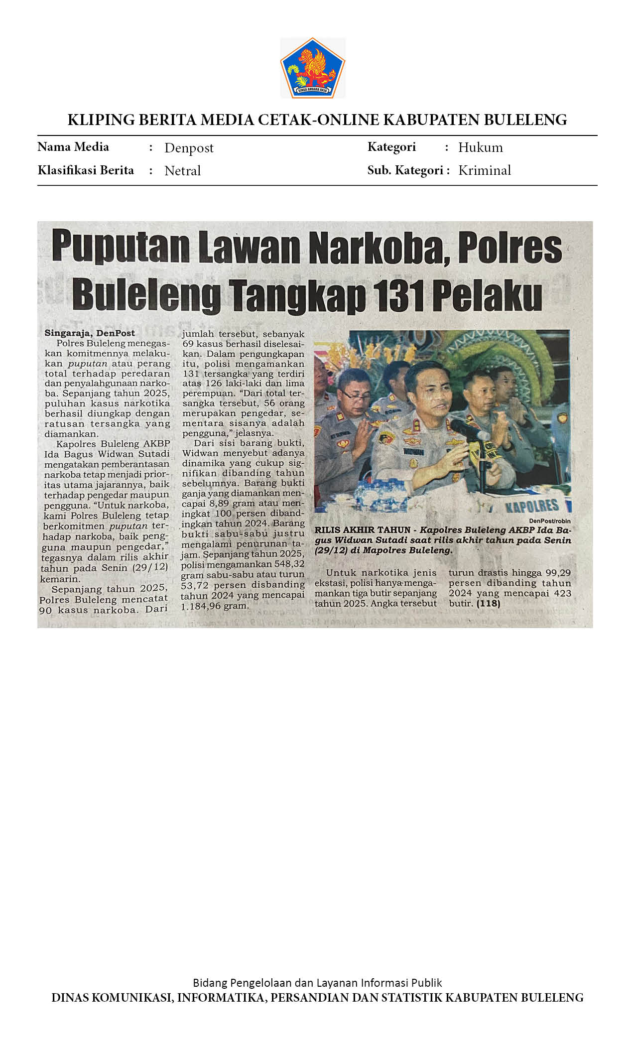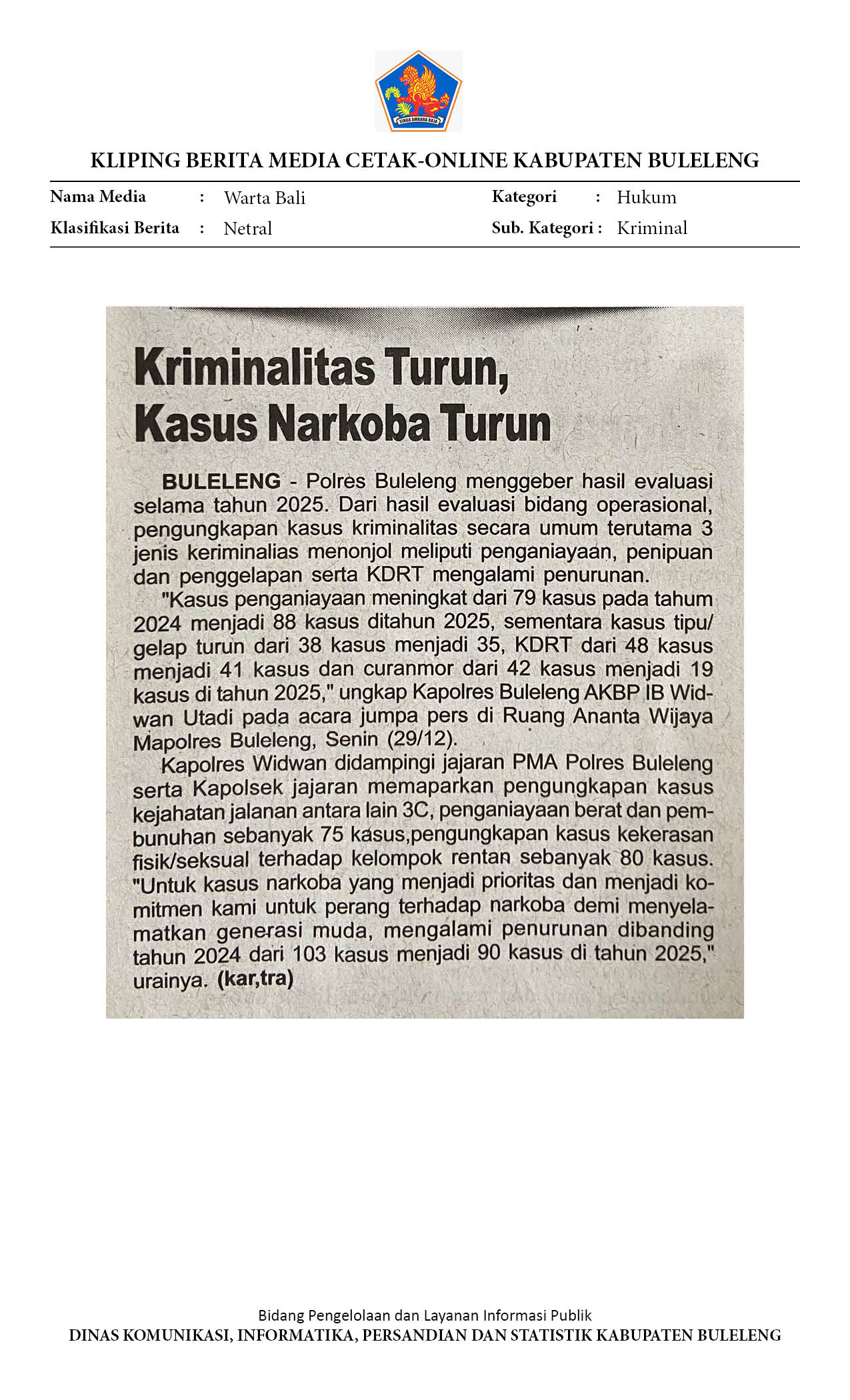 KASUS KRIMINALITAS 2025 DI BULELENG, PENGANIAYAAN MASIH MENDOMINASI HINGGA KASUS KORUPSI RP. 15,4 MILIAR