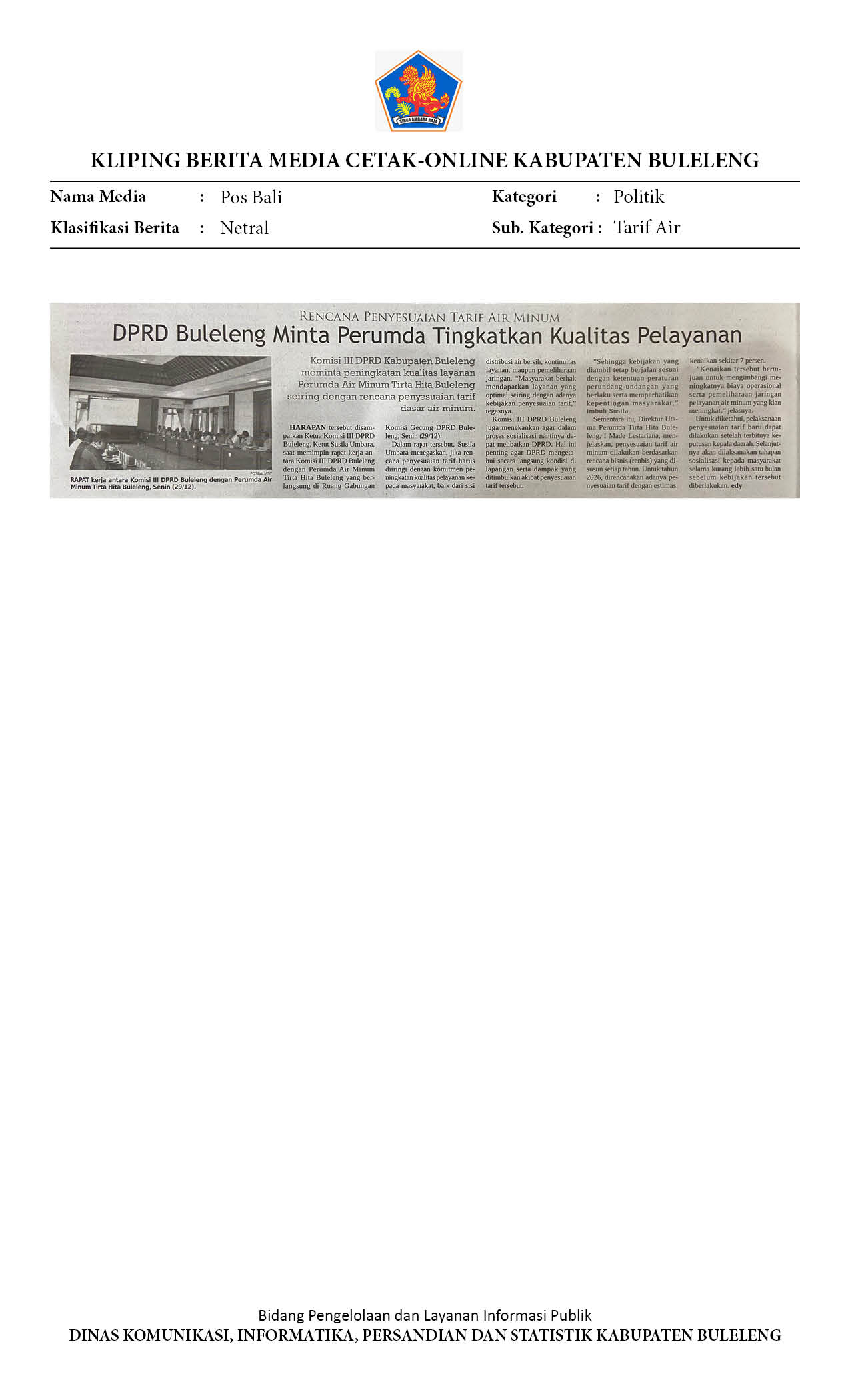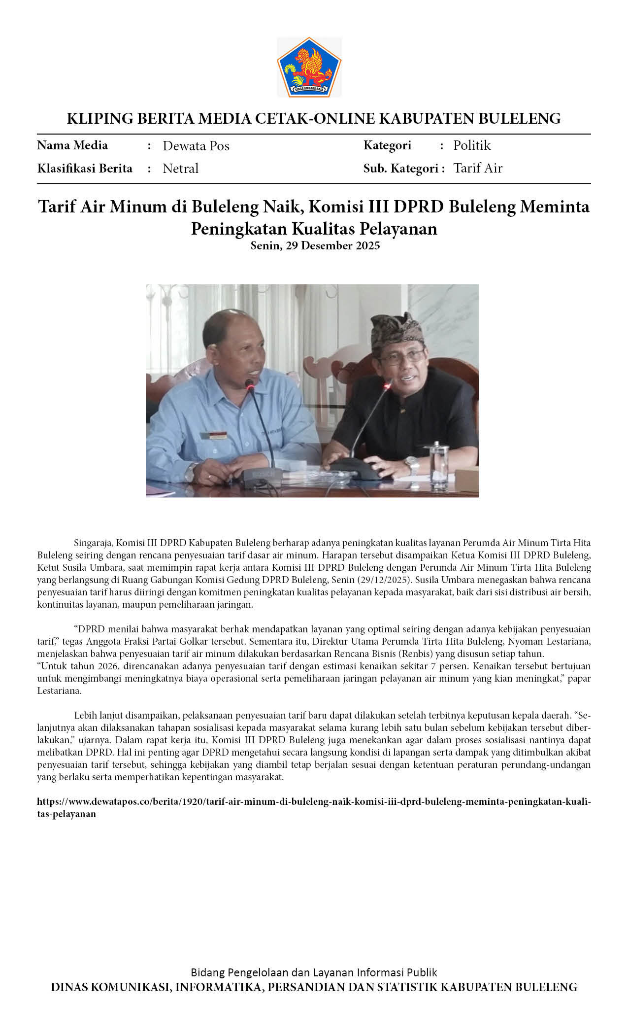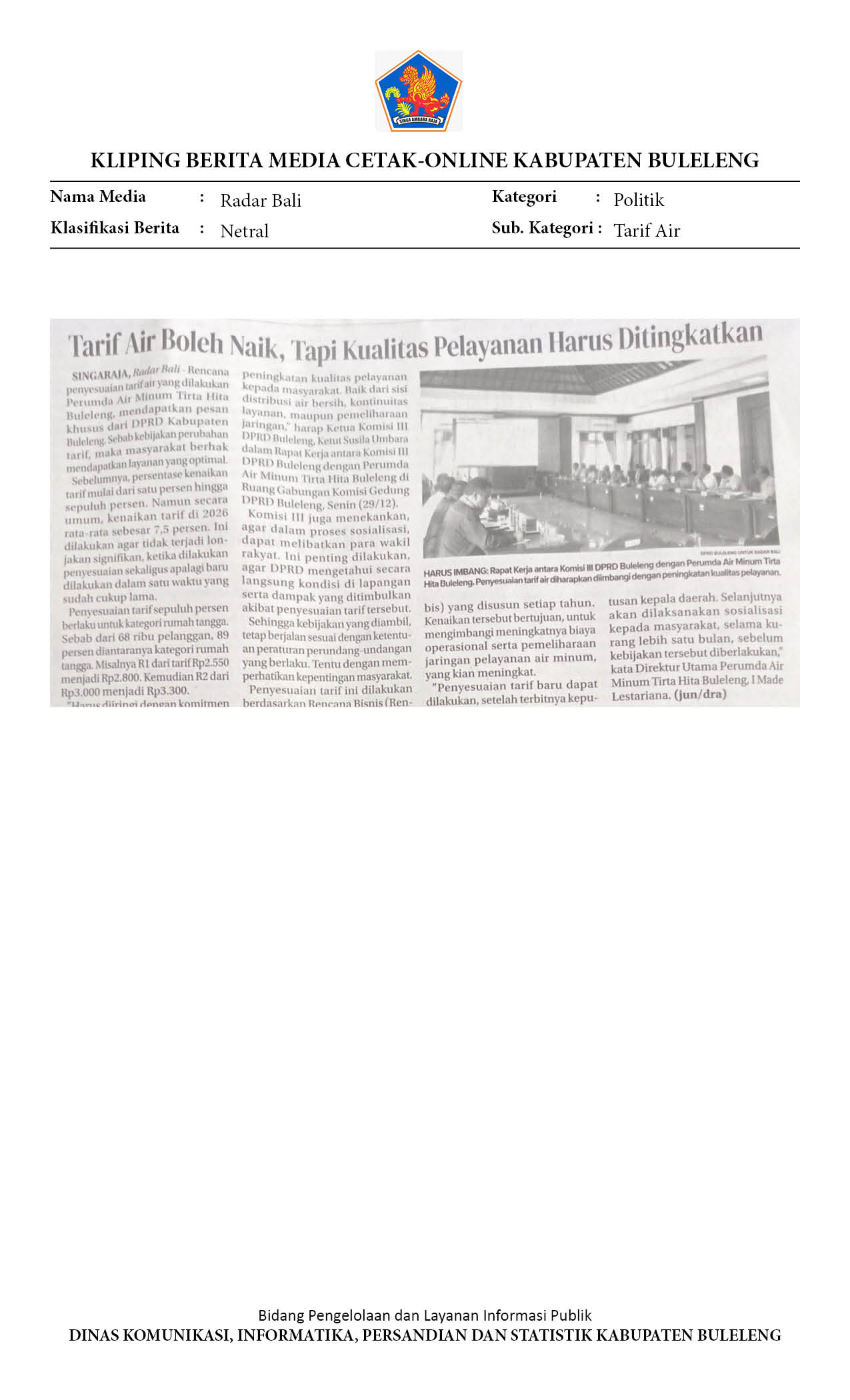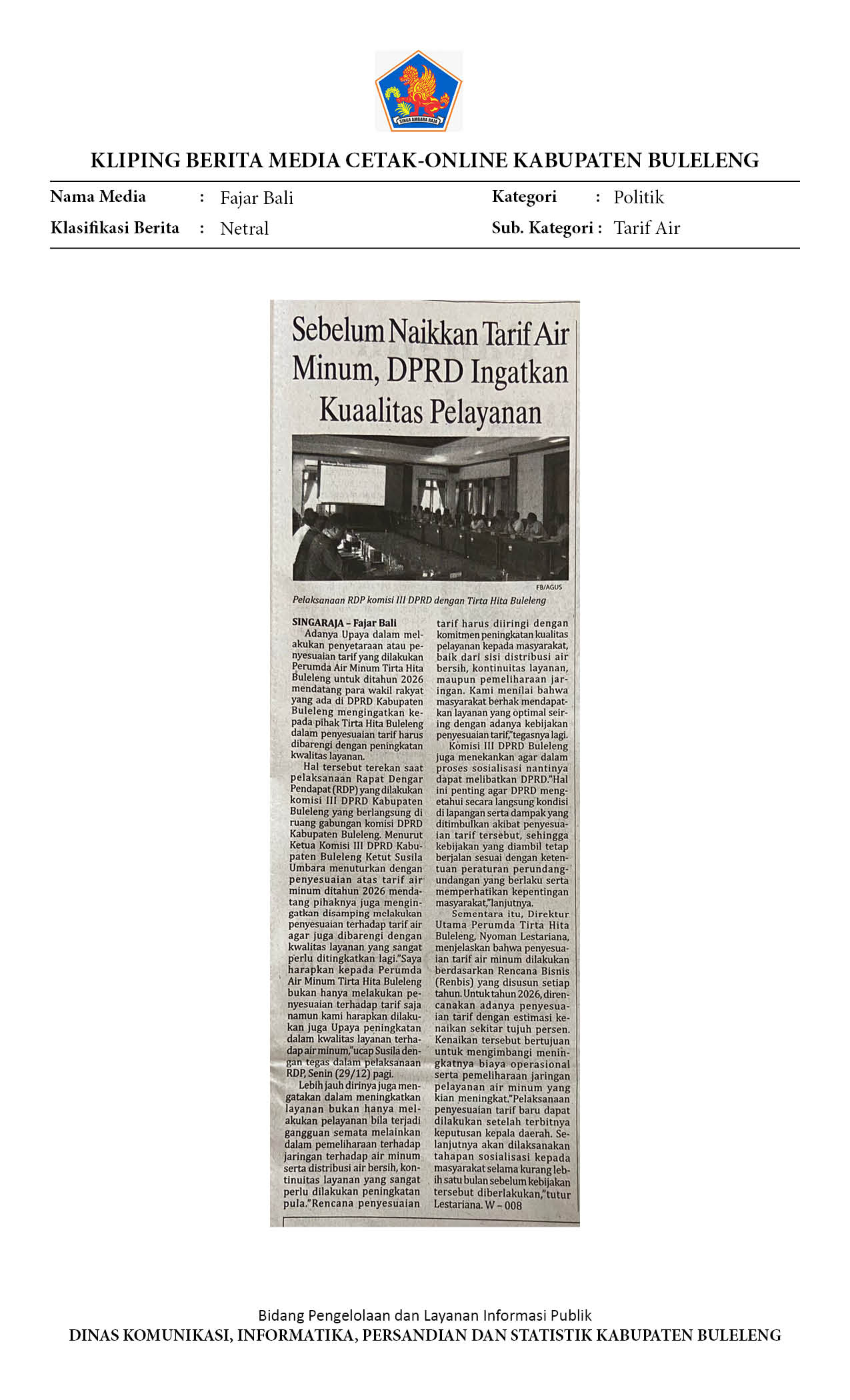 RENCANA PENYESUAIAN TARIF AIR MINUM, KOMISI III DPRD BULELENG MINTA PERUMDA TIRTA HITA TINGKATKAN KUALITAS PELAYANAN