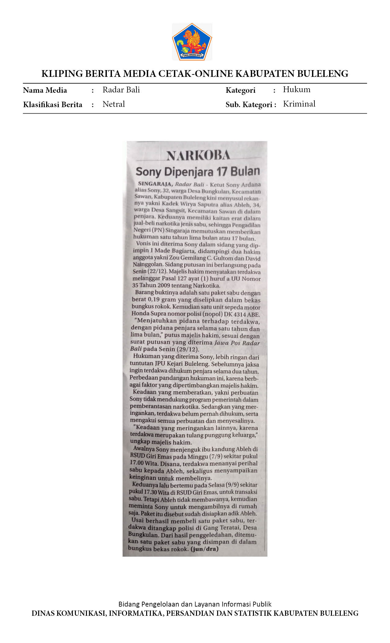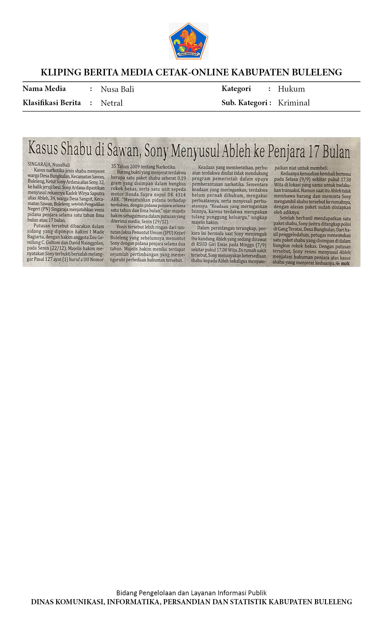 KASUS SHABU DI SAWAN, SONY MENYUSUL ABLEH KE PENJARA 17 BULAN