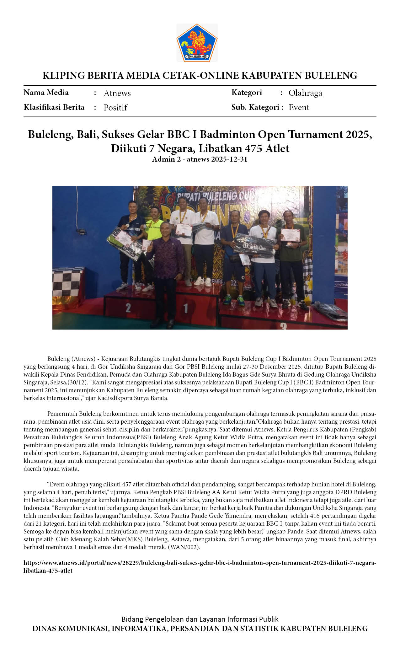 BULELENG, BALI, SUKSES GELAR BBC I BADMINTON OPEN TURNAMENT 2025, DIIKUTI 7 NEGARA, LIBATKAN 475 ATLET