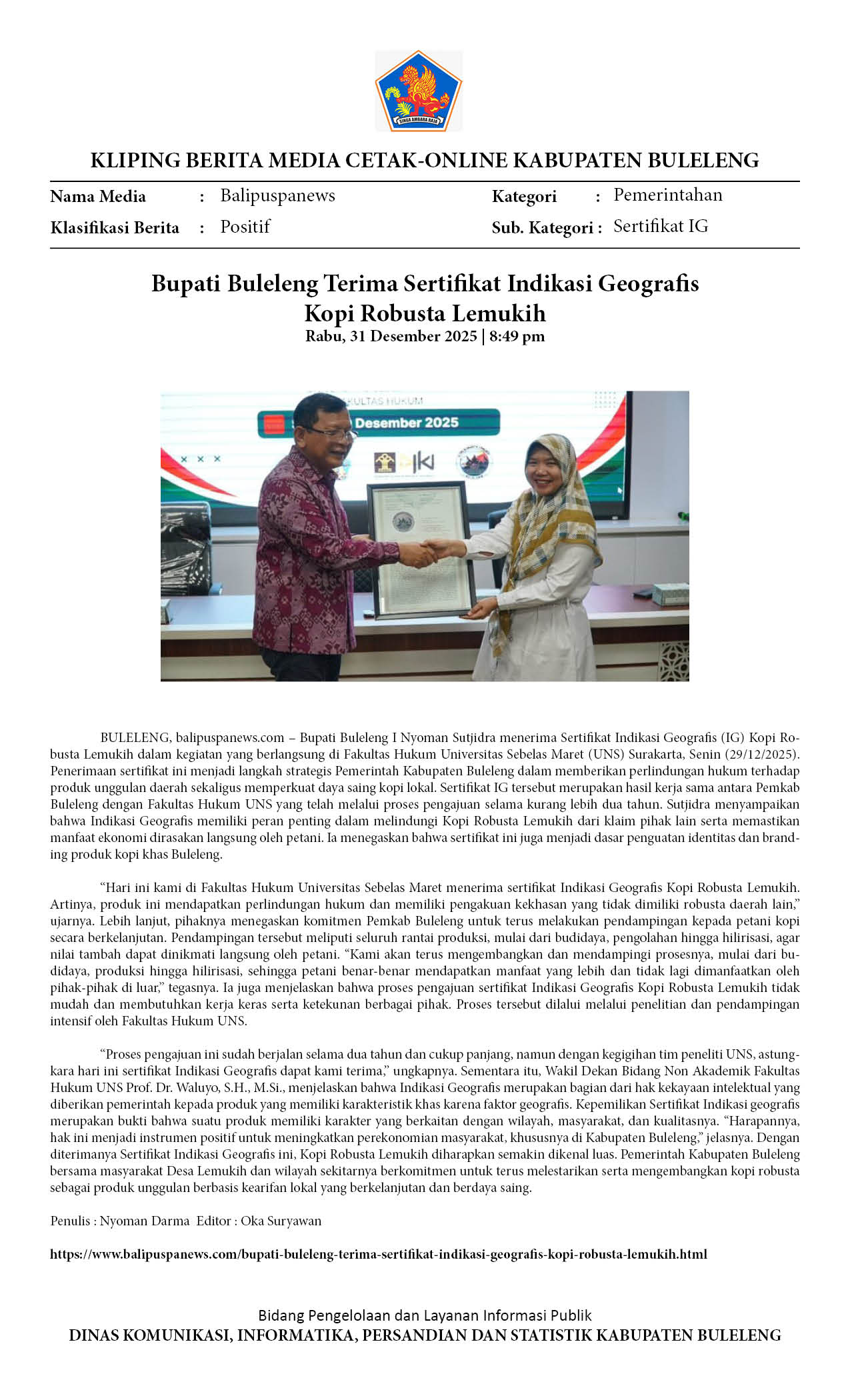 BUPATI BULELENG TERIMA SERTIFIKAT INDIKASI GEOGRAFIS KOPI ROBUSTA LEMUKIH