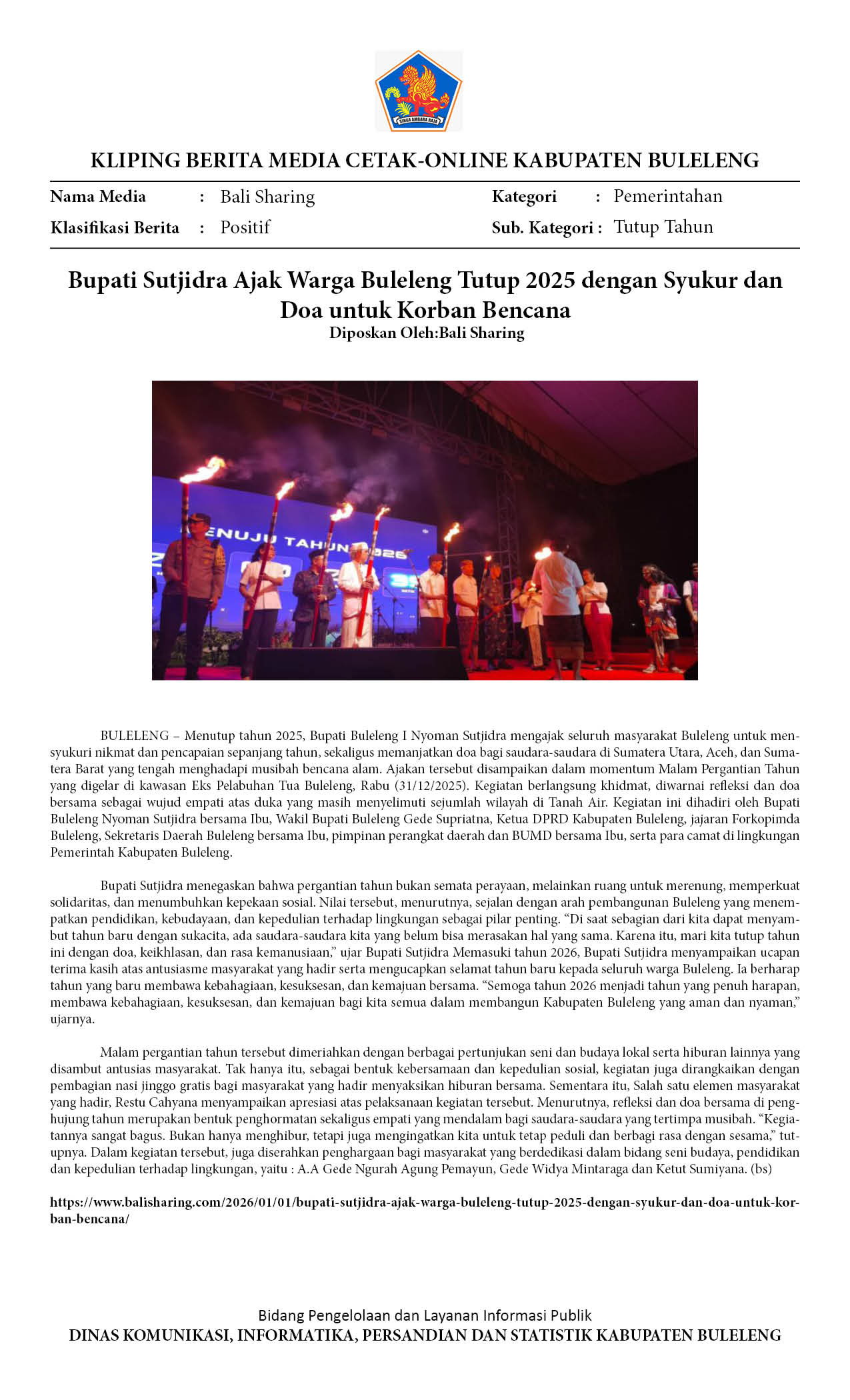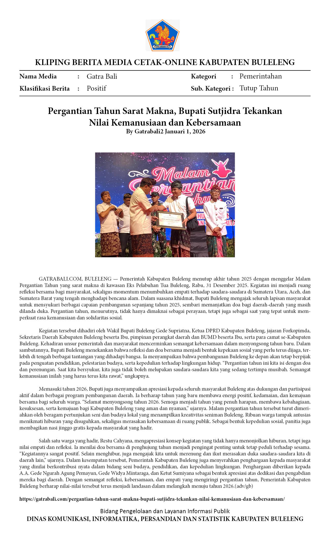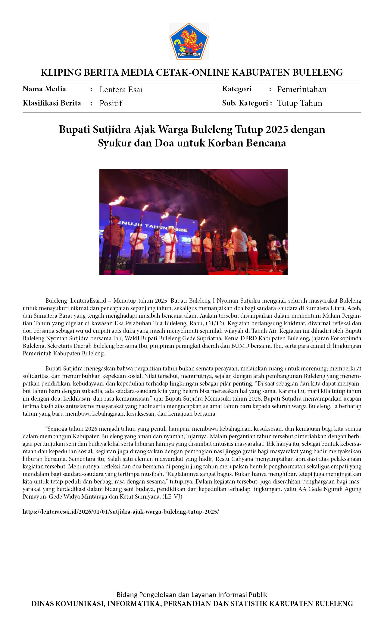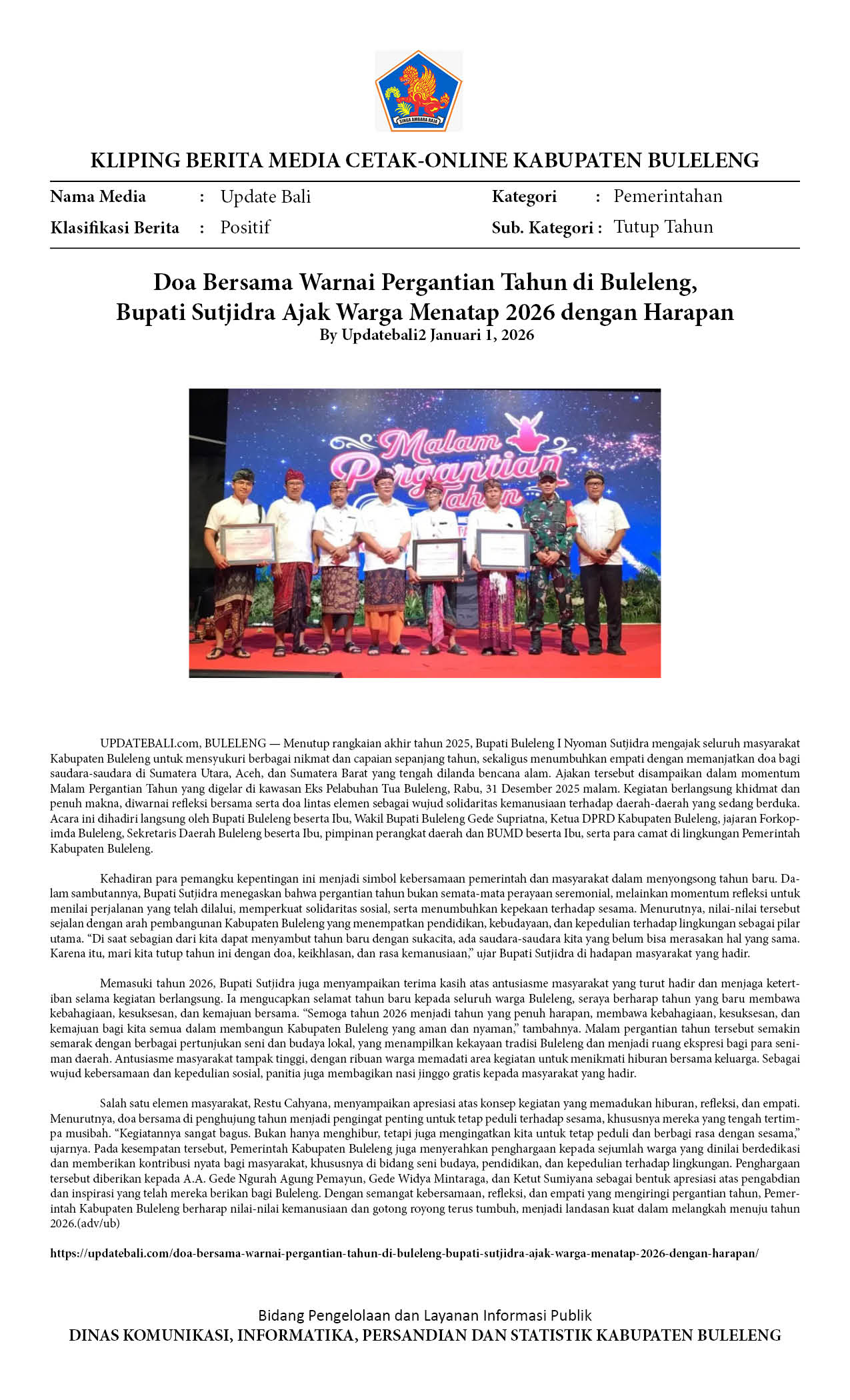 DOA BERSAMA WARNAI PERGANTIAN TAHUN DI BULELENG, BUPATI SUTJIDRA AJAK WARGA MENATAP 2026 DENGAN HARAPAN