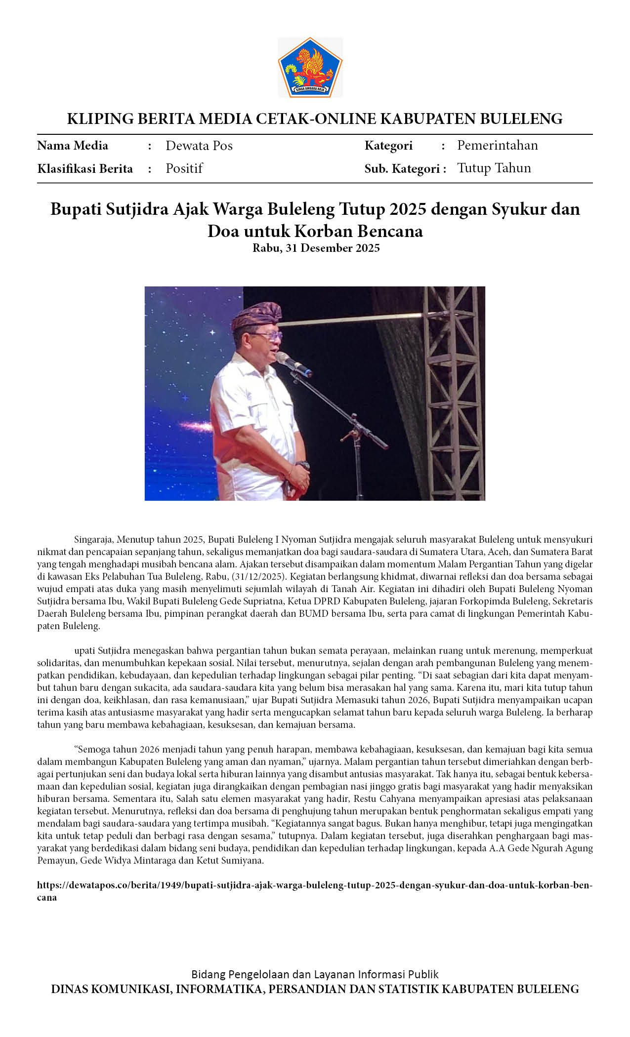 BUPATI SUTJIDRA AJAK WARGA BULELENG TUTUP 2025 DENGAN SYUKUR DAN DOA UNTUK KORBAN BENCANA