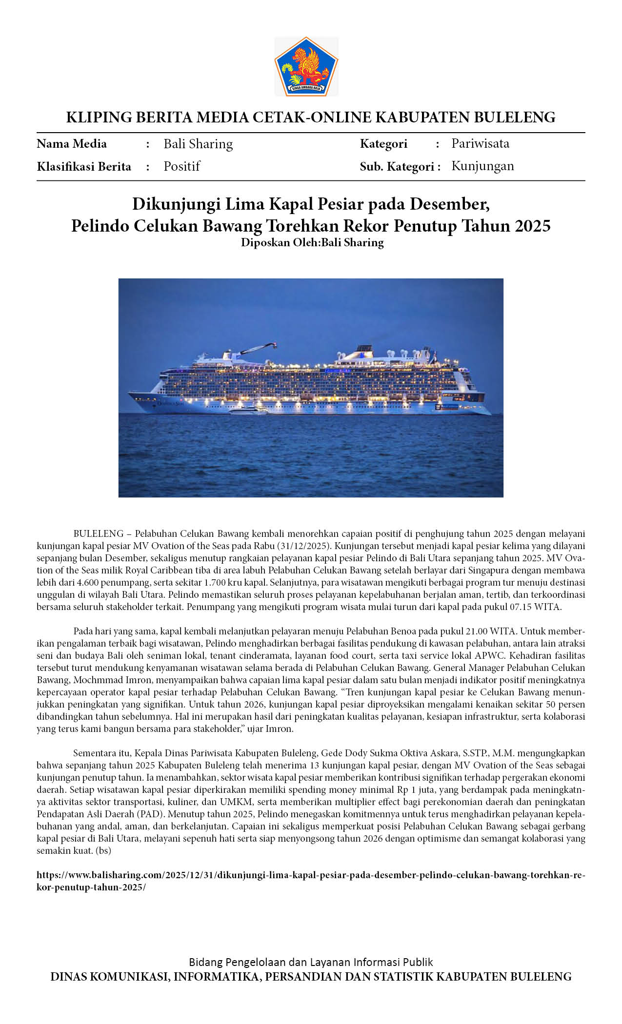 DIKUNJUNGI LIMA KAPAL PESIAR PADA DESEMBER, PELINDO CELUKAN BAWANG TOREHKAN REKOR PENUTUP TAHUN 2025