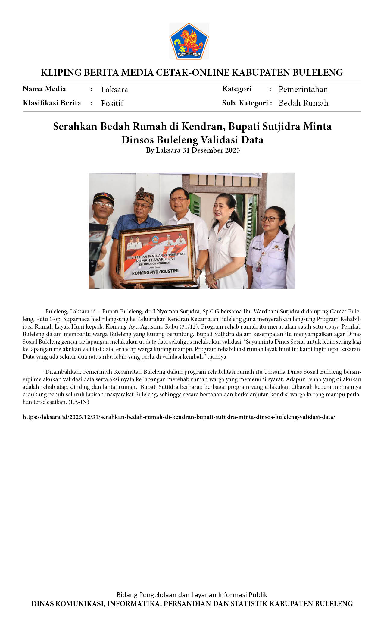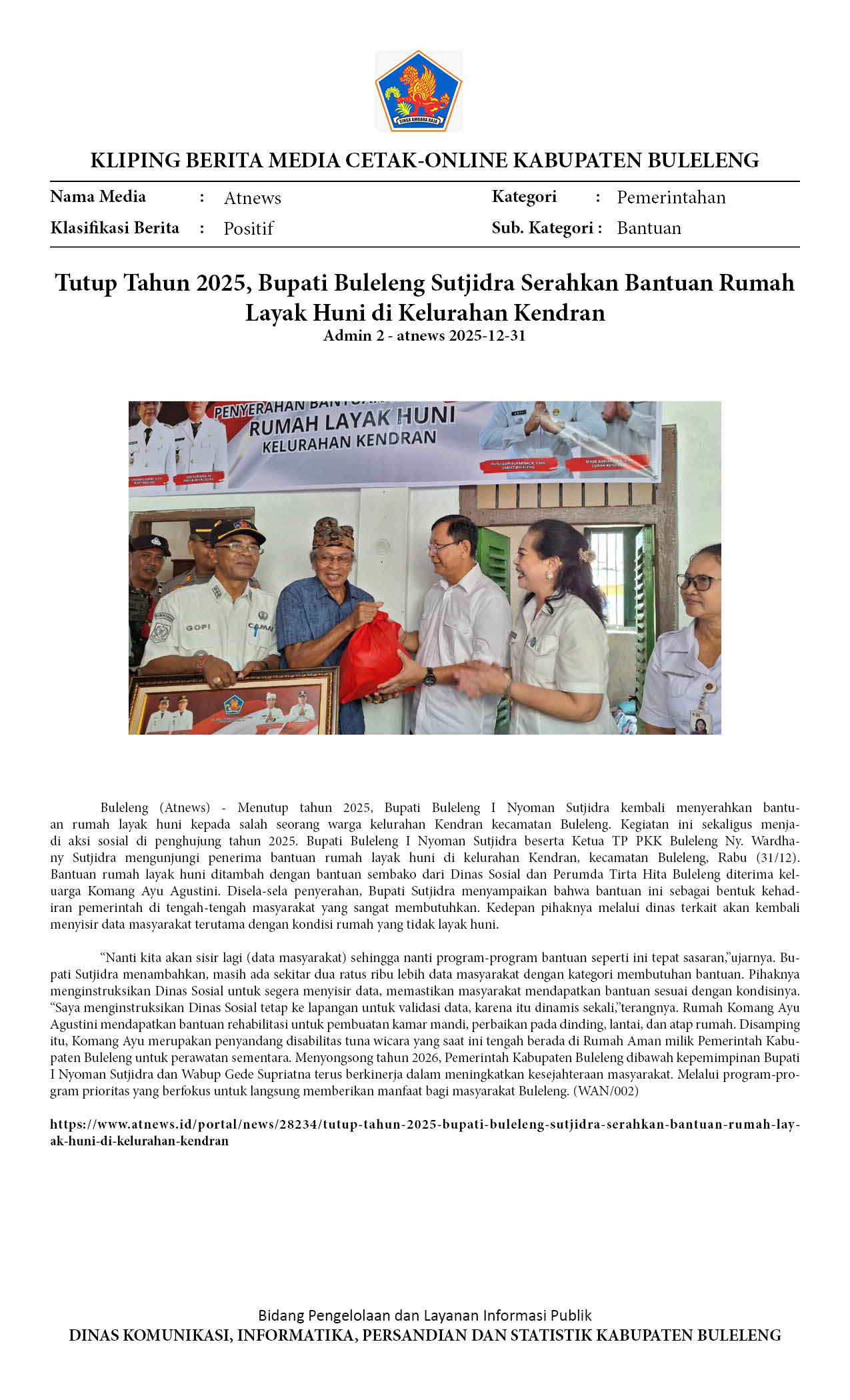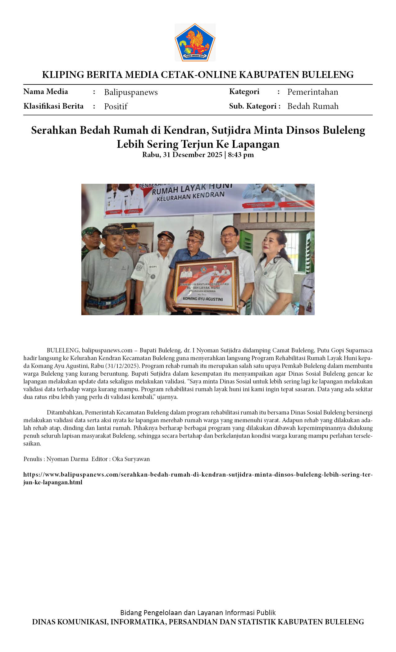 TUTUP TAHUN 2025, BUPATI BULELENG SUTJIDRA SERAHKAN BANTUAN RUMAH LAYAK HUNI DI KELURAHAN KENDRAN