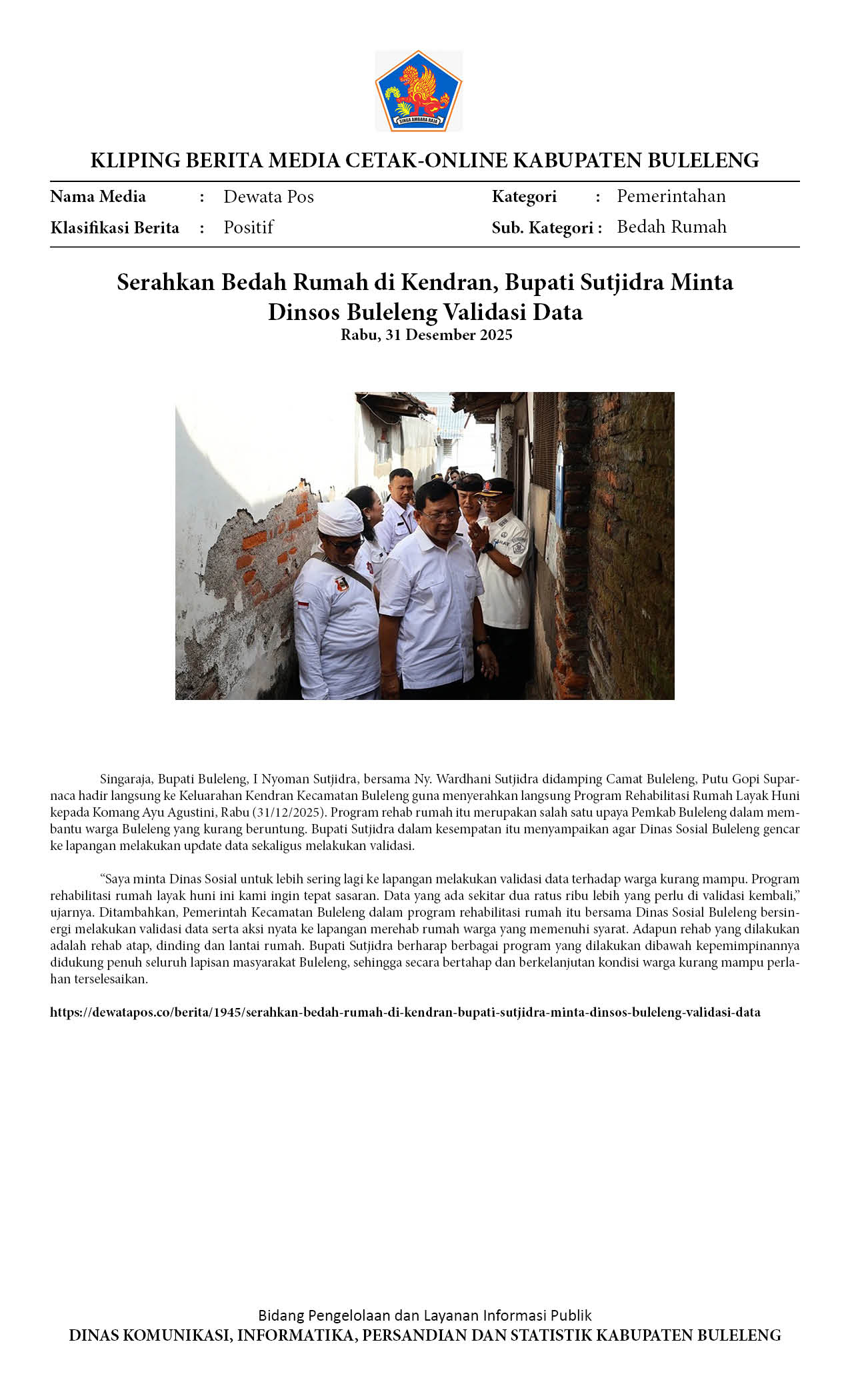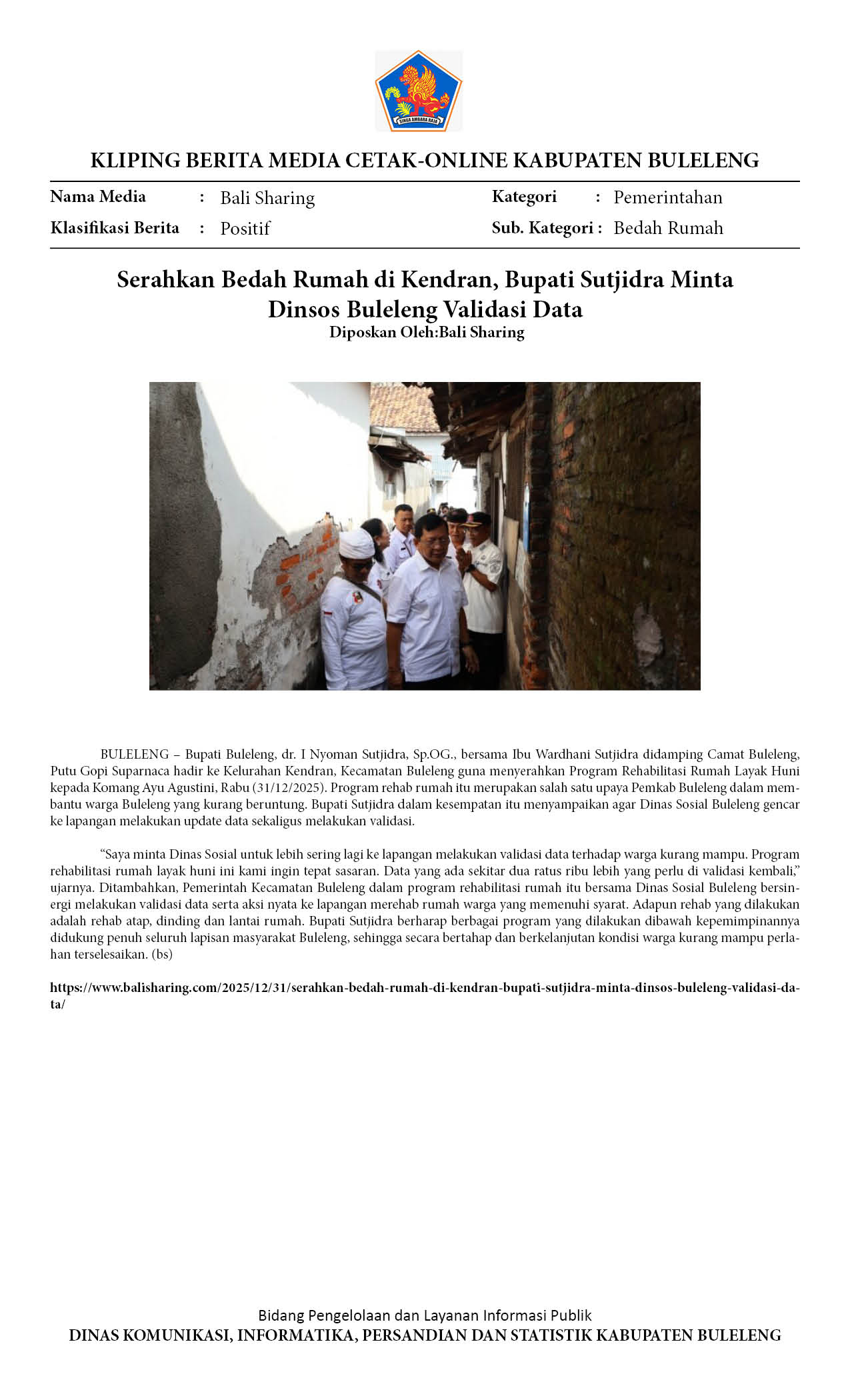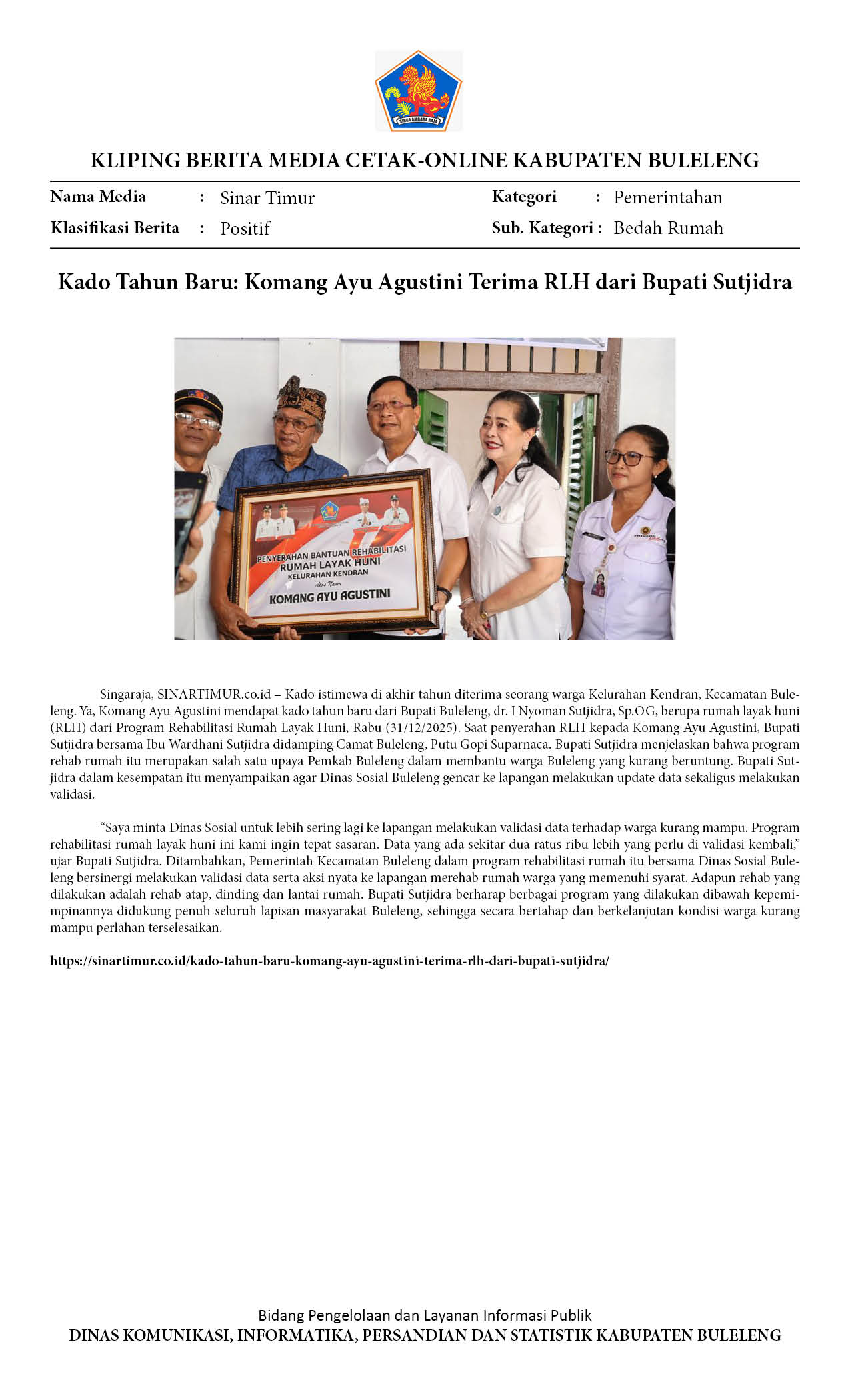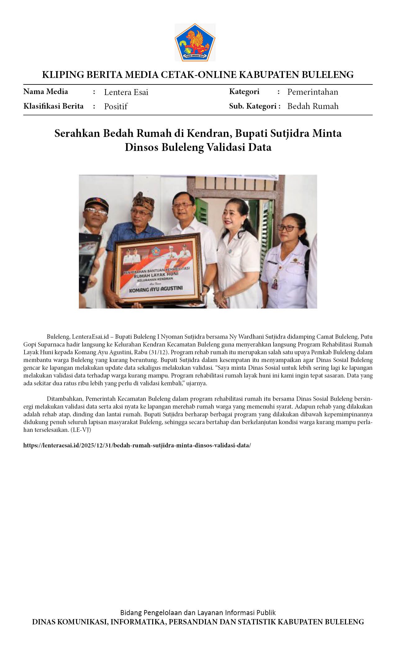 TUTUP TAHUN 2025, BUPATI BULELENG SUTJIDRA SERAHKAN BANTUAN RUMAH LAYAK HUNI DI KELURAHAN KENDRAN