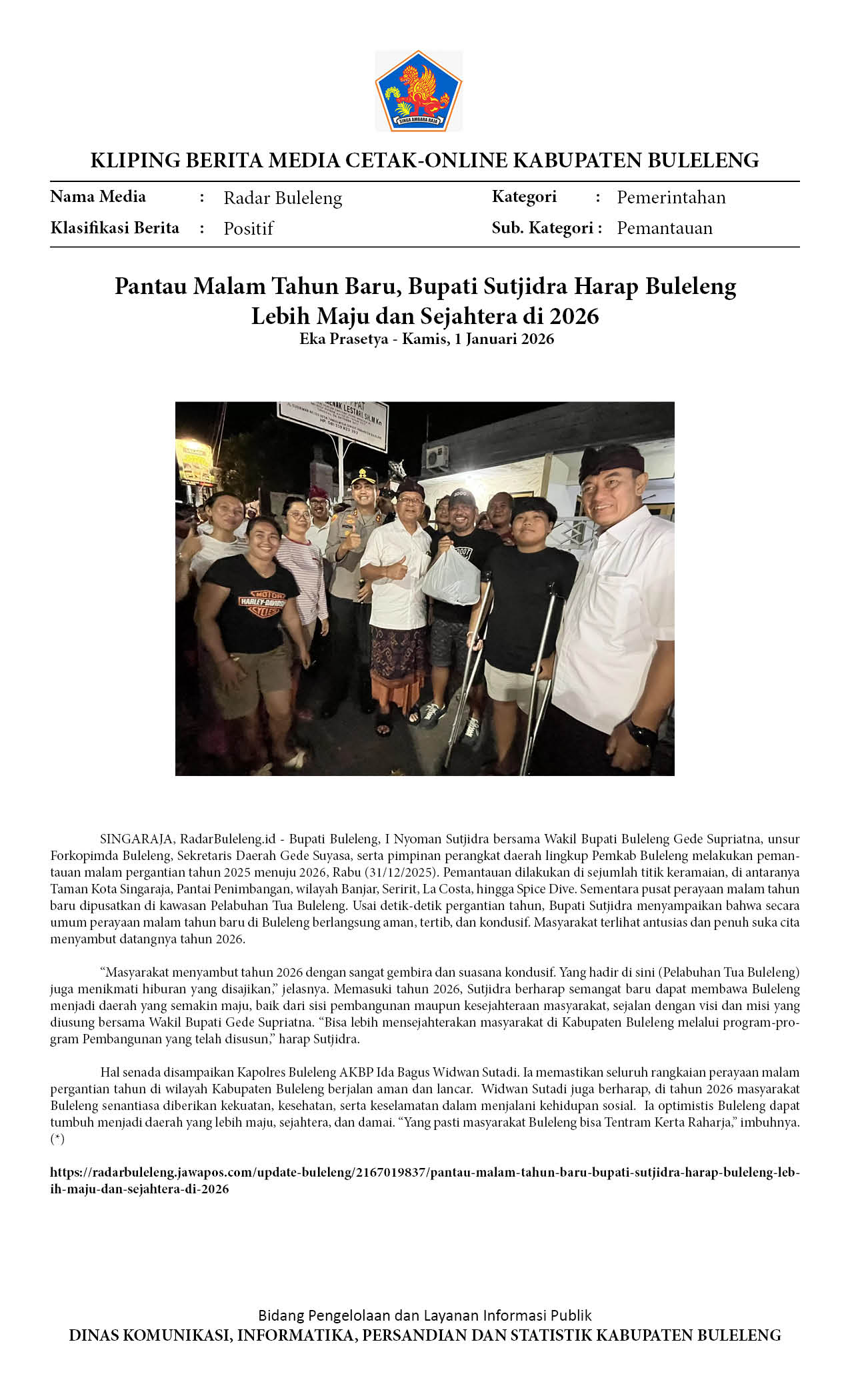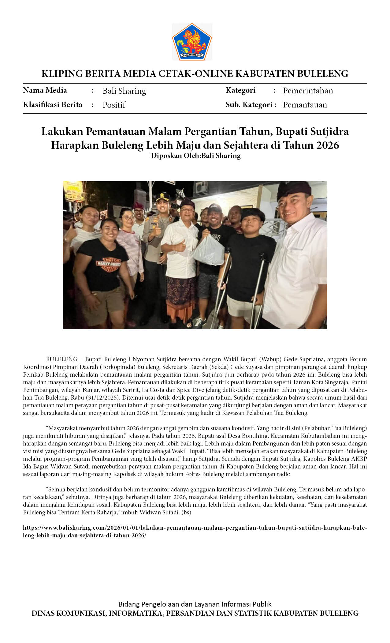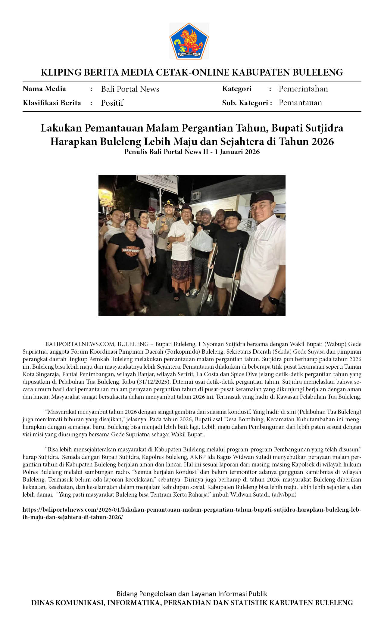 LAKUKAN PEMANTAUAN MALAM PERGANTIAN TAHUN, BUPATI SUTJIDRA HARAPKAN BULELENG LEBIH MAJU DAN SEJAHTERA DI TAHUN 2026