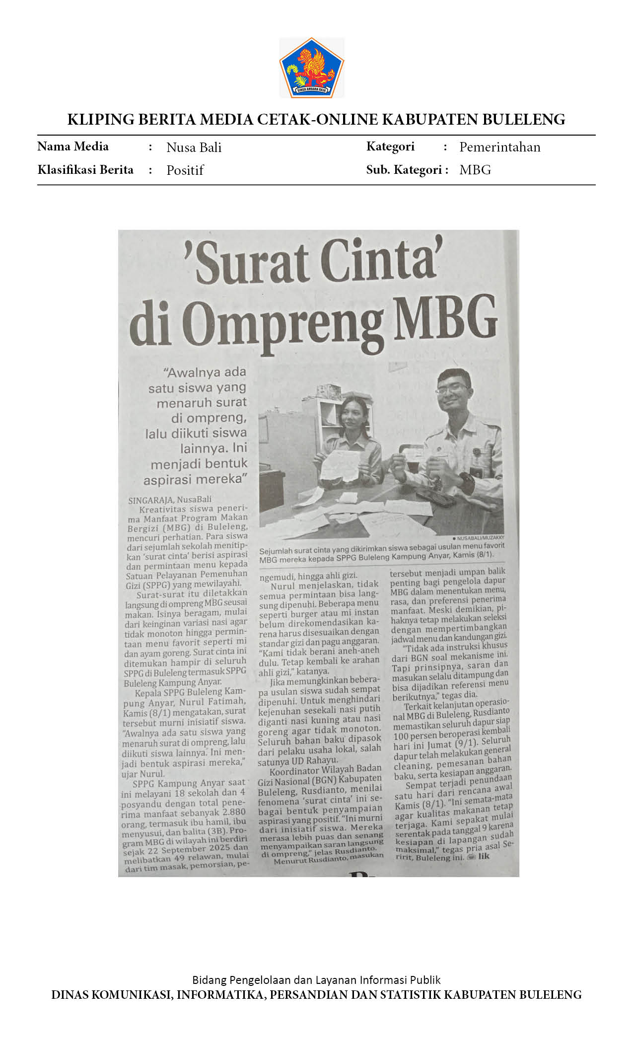 MBG DI BULELENG DIPERKUAT, PEMDA PASTIKAN MUTU PANGAN DAN DAMPAK EKONOMI