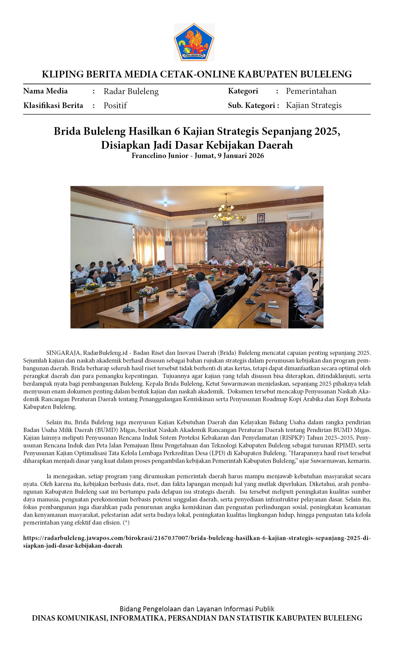 BRIDA BULELENG HASILKAN 6 KAJIAN STRATEGIS SEPANJANG 2025, DISIAPKAN JADI DASAR KEBIJAKAN DAERAH