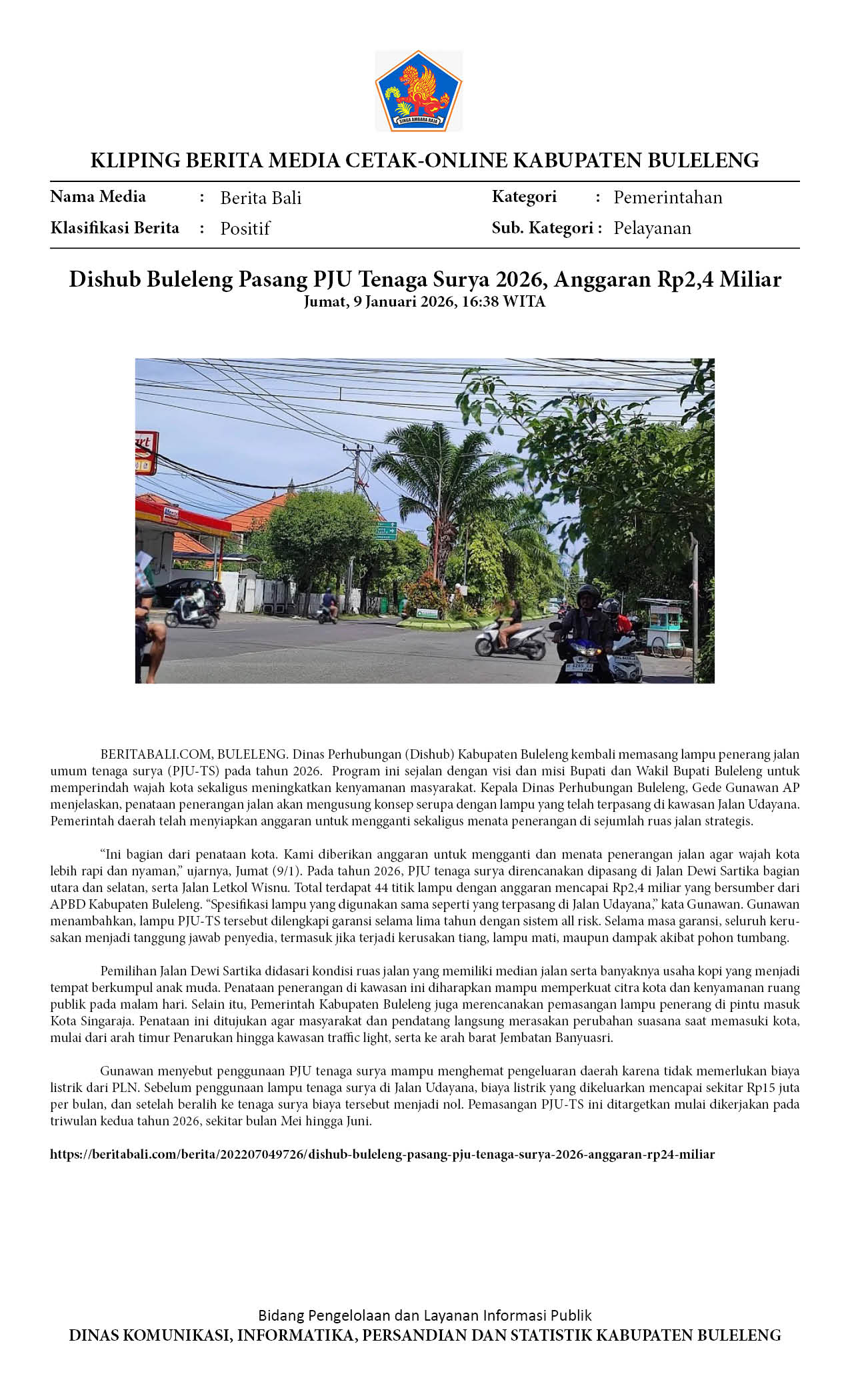 DISHUB BULELENG PASANG PJU TENAGA SURYA 2026, ANGGARAN RP2,4 MILIAR