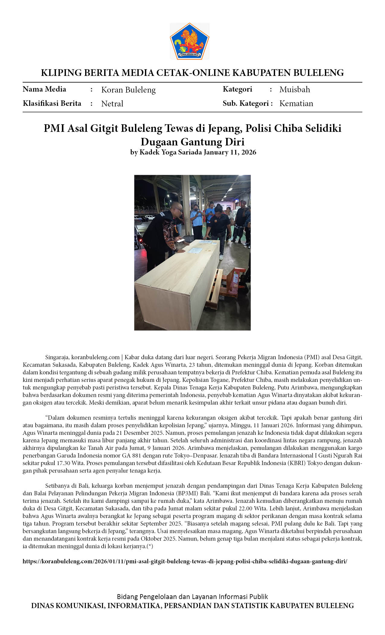 PMI ASAL GITGIT BULELENG TEWAS DI JEPANG, POLISI CHIBA SELIDIKI DUGAAN GANTUNG DIRI
