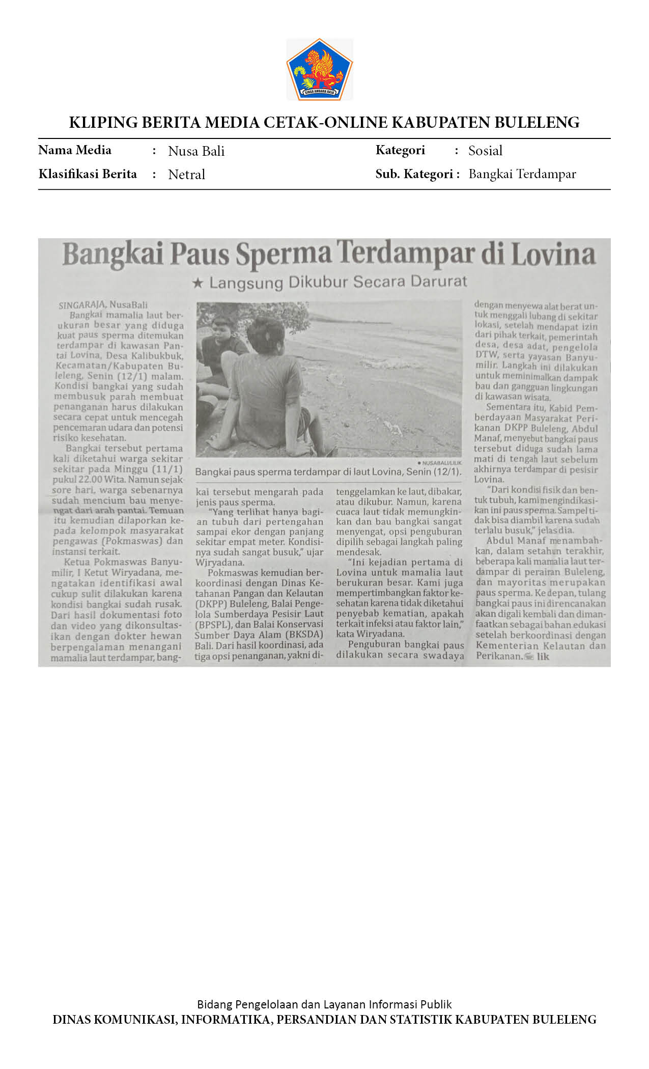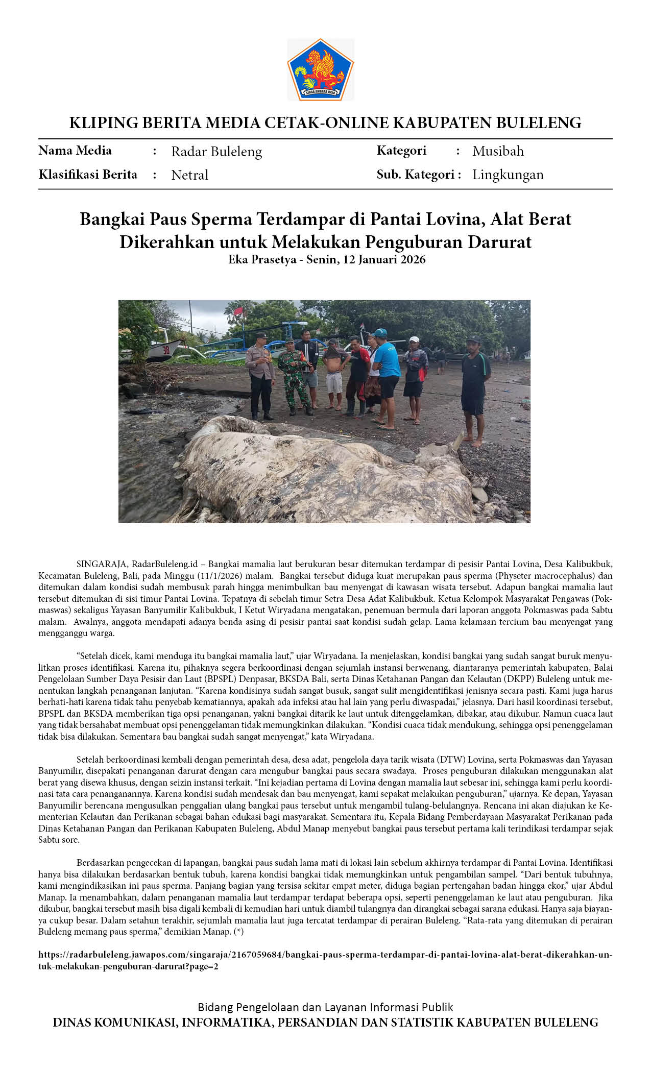 BANGKAI PAUS SPERMA TERDAMPAR DI PANTAI LOVINA, ALAT BERAT DIKERAHKAN UNTUK MELAKUKAN PENGUBURAN DARURAT