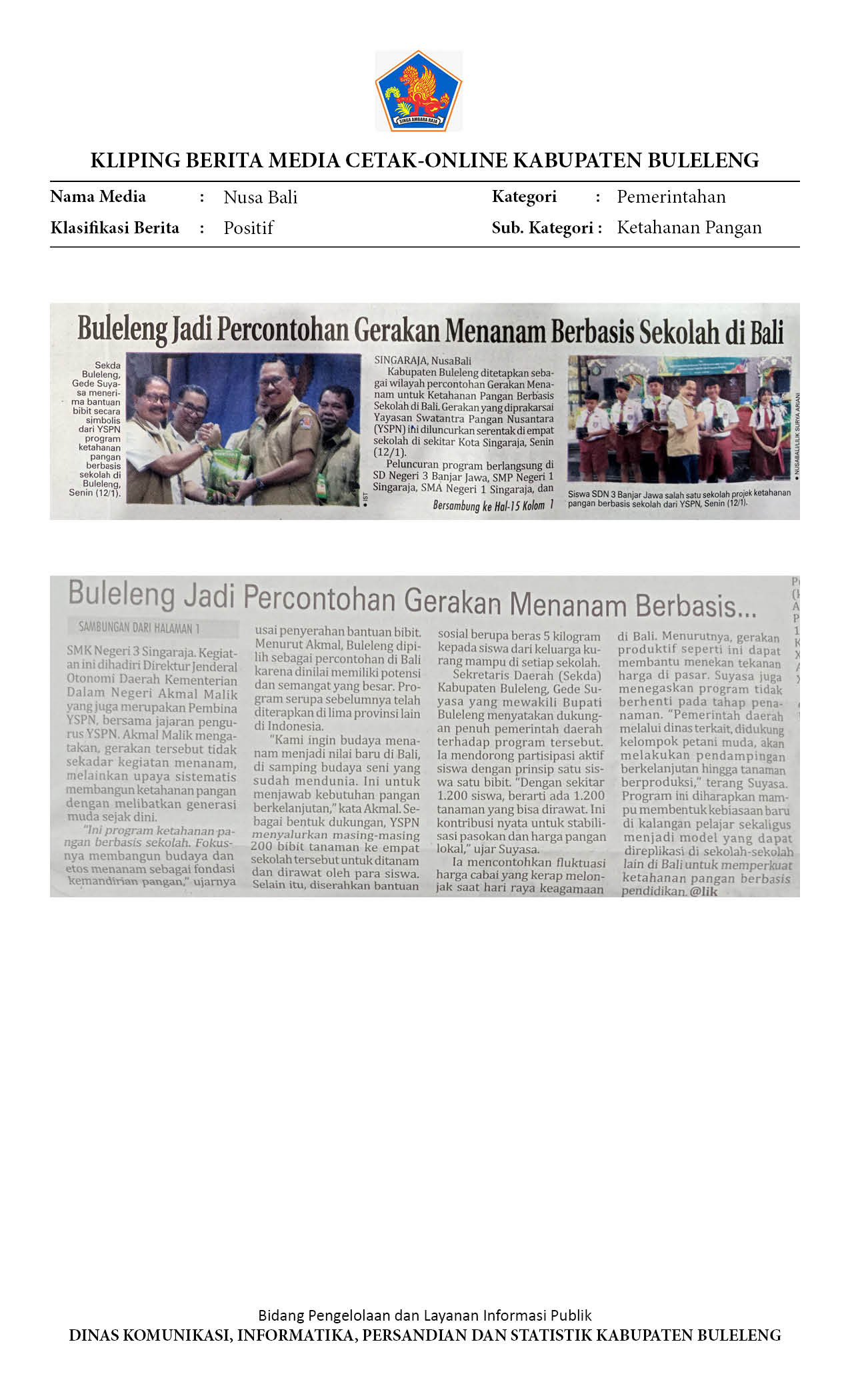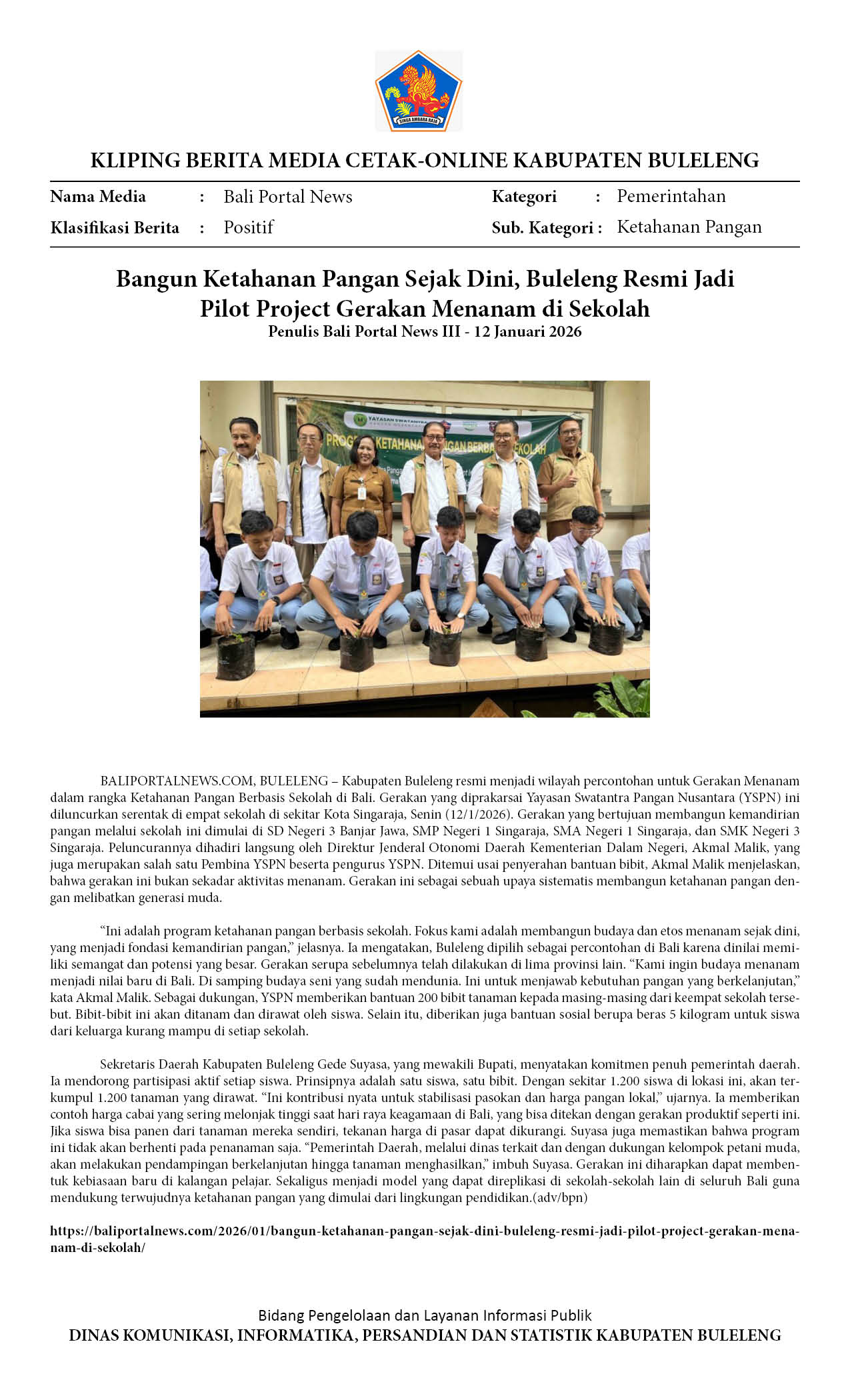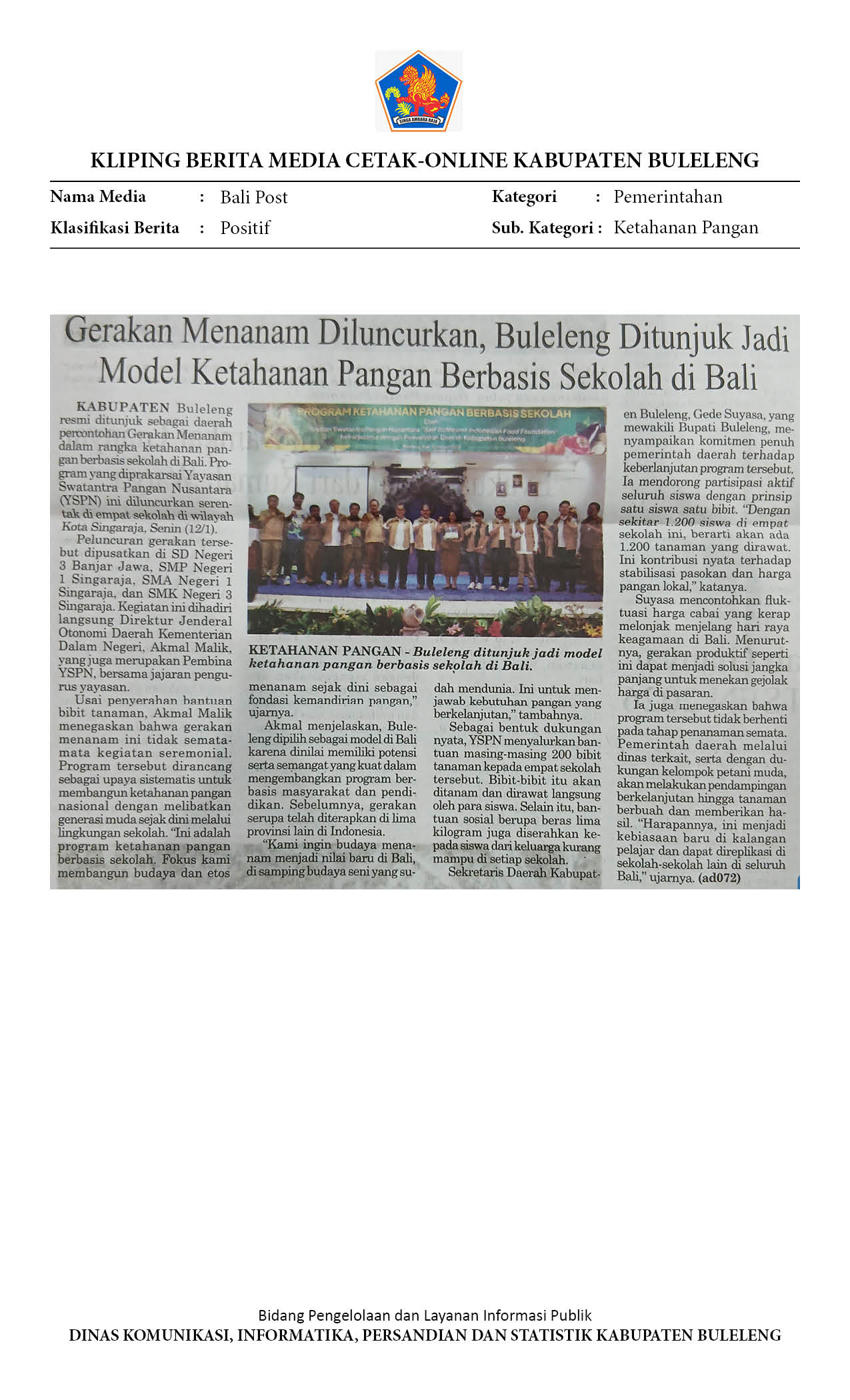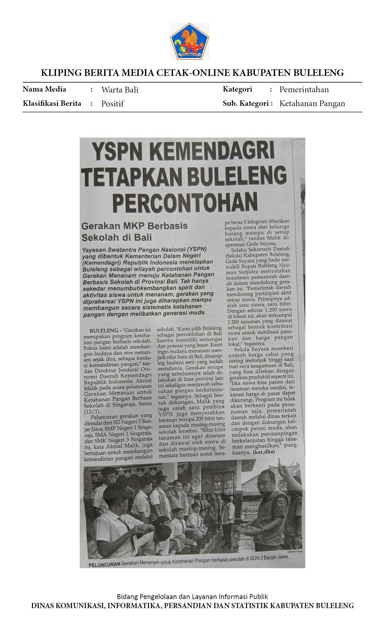 BULELENG AWALI GERAKAN MENANAM SEKOLAH SEBAGAI MODEL KETAHANAN PANGAN BALI