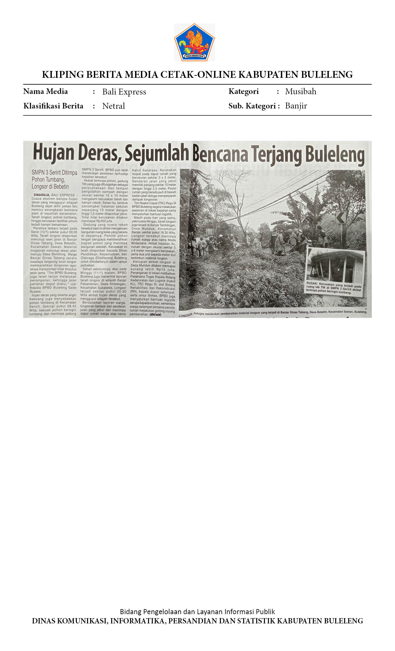 HUJAN DERAS, SEJUMLAH BENCANA TERJANG BULELENG