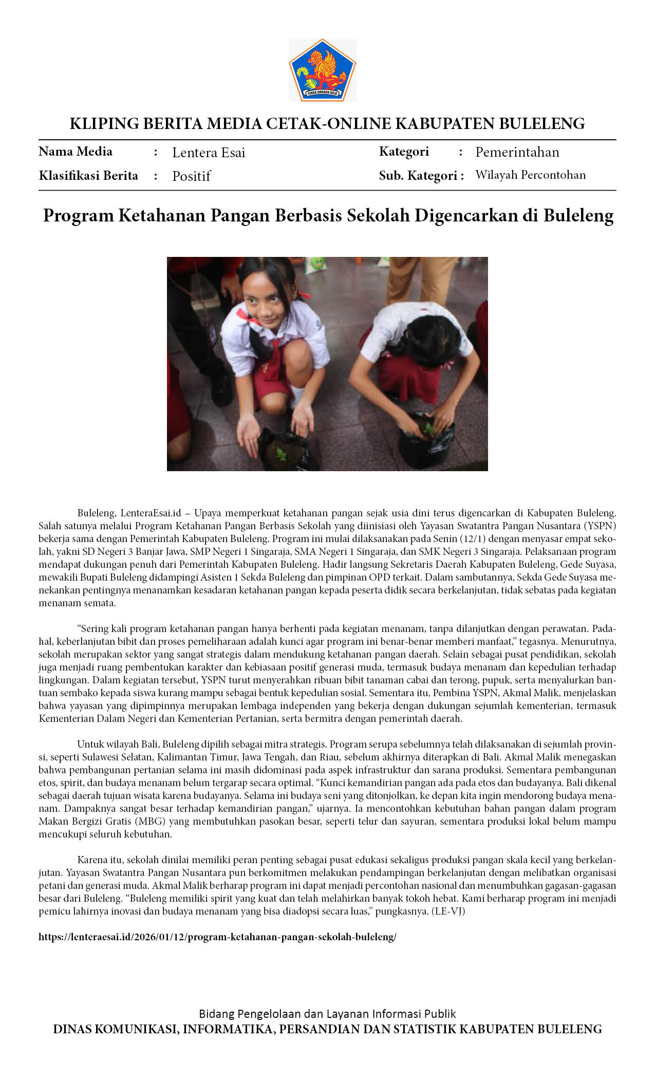 BULELENG JADI PERCONTOHAN GERAKAN MENANAM UNTUK KETAHANAN PANGAN BERBASIS SEKOLAH DI BALI