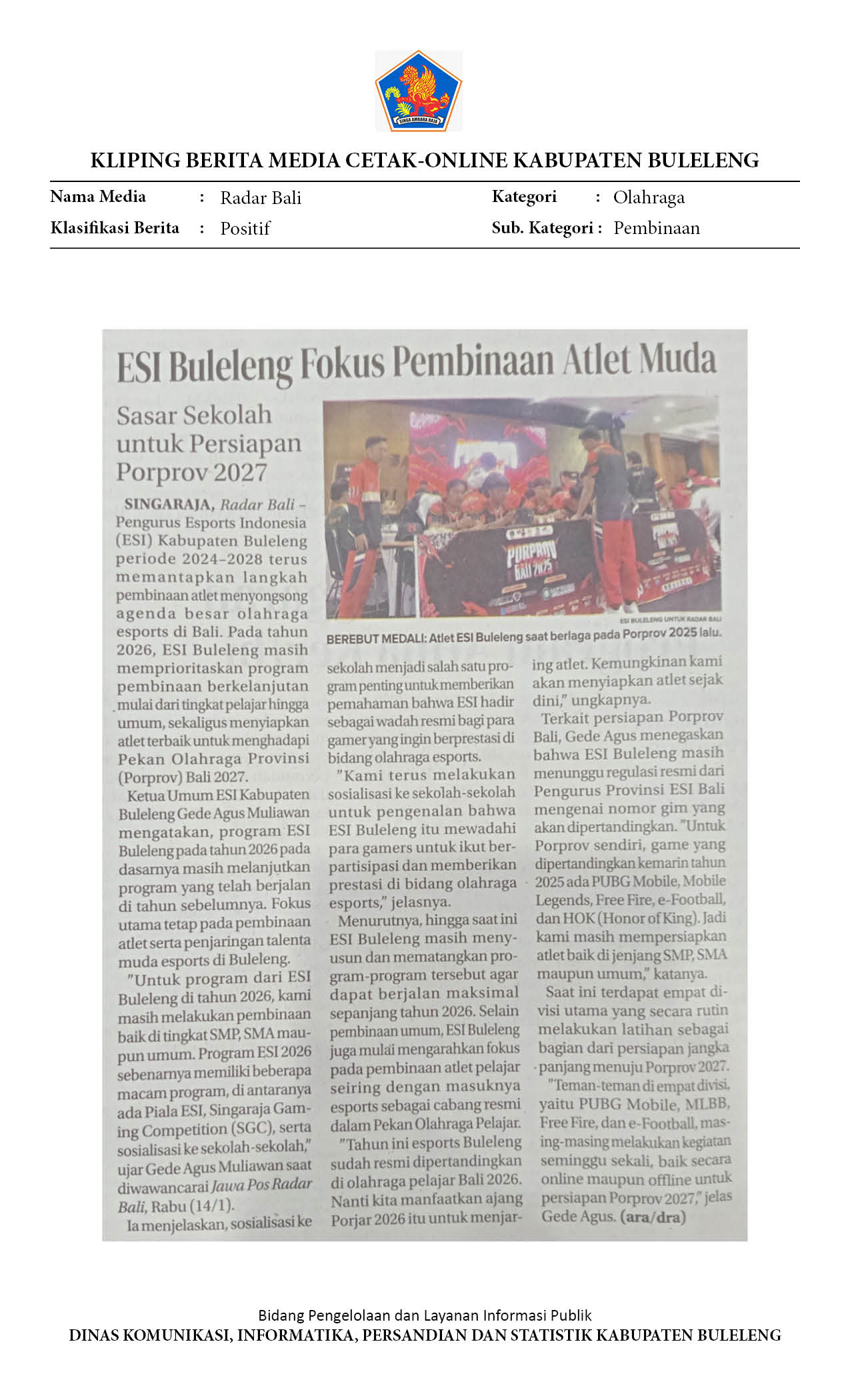 ESI BULELENG FOKUS PEMBINAAN ATLET MUDA