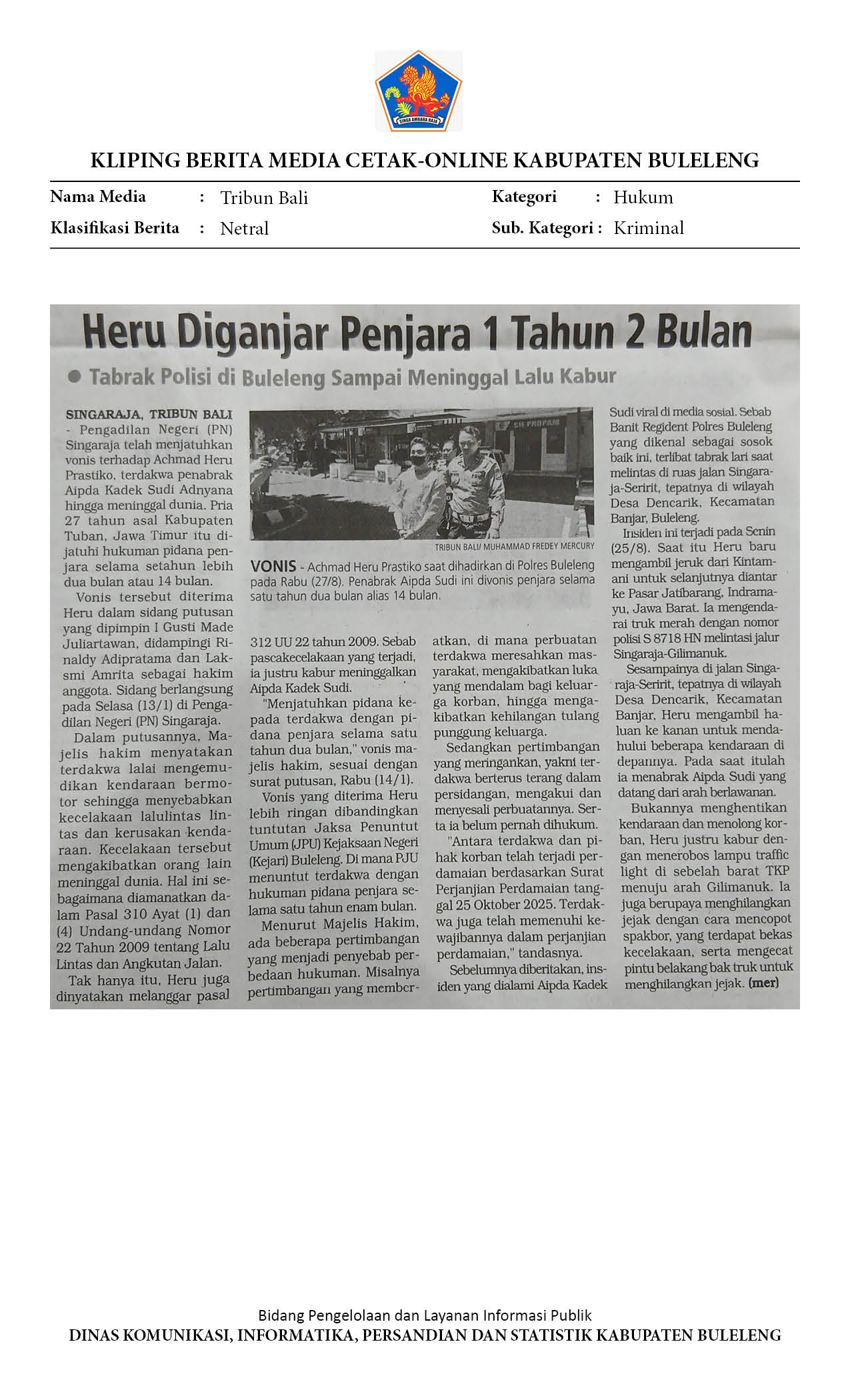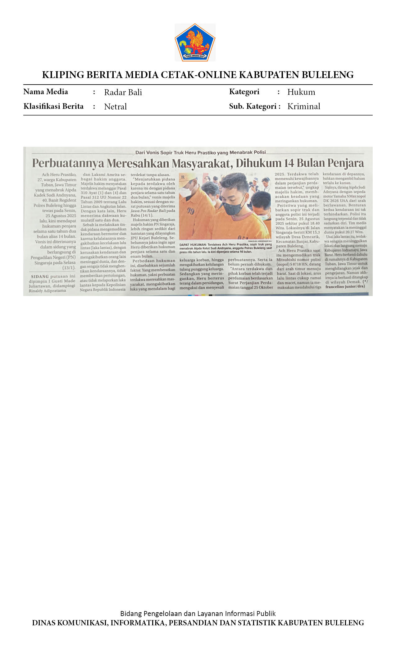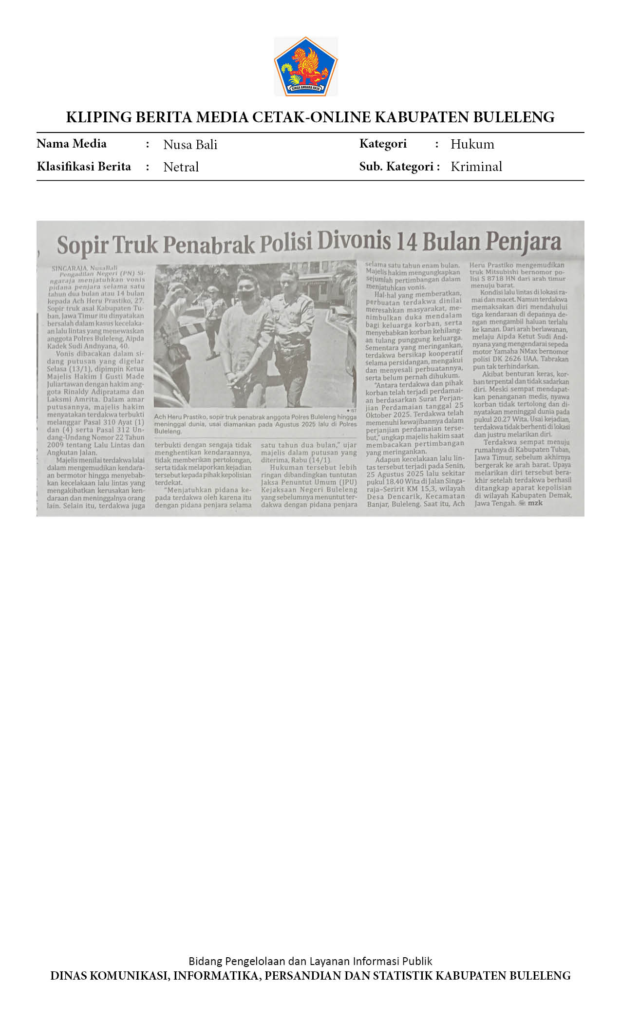 HUKUM: 14 BULAN PENJARA UNTUK SOPIR TRUK PENABRAK POLISI DI BULELENG