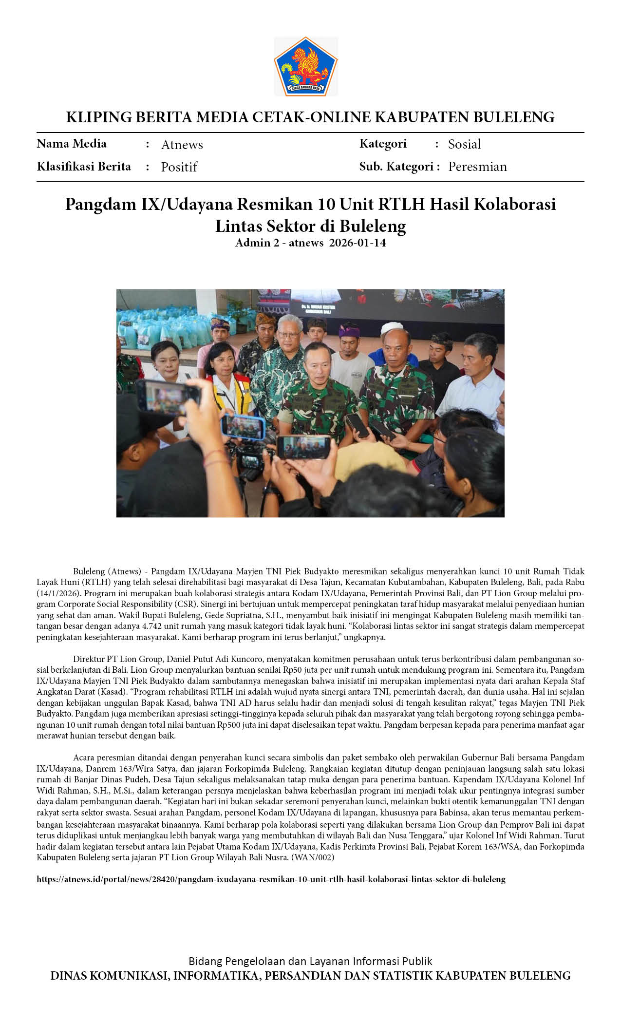 PANGDAM IX/UDAYANA RESMIKAN 10 UNIT RTLH HASIL KOLABORASI LINTAS SEKTOR DI BULELENG