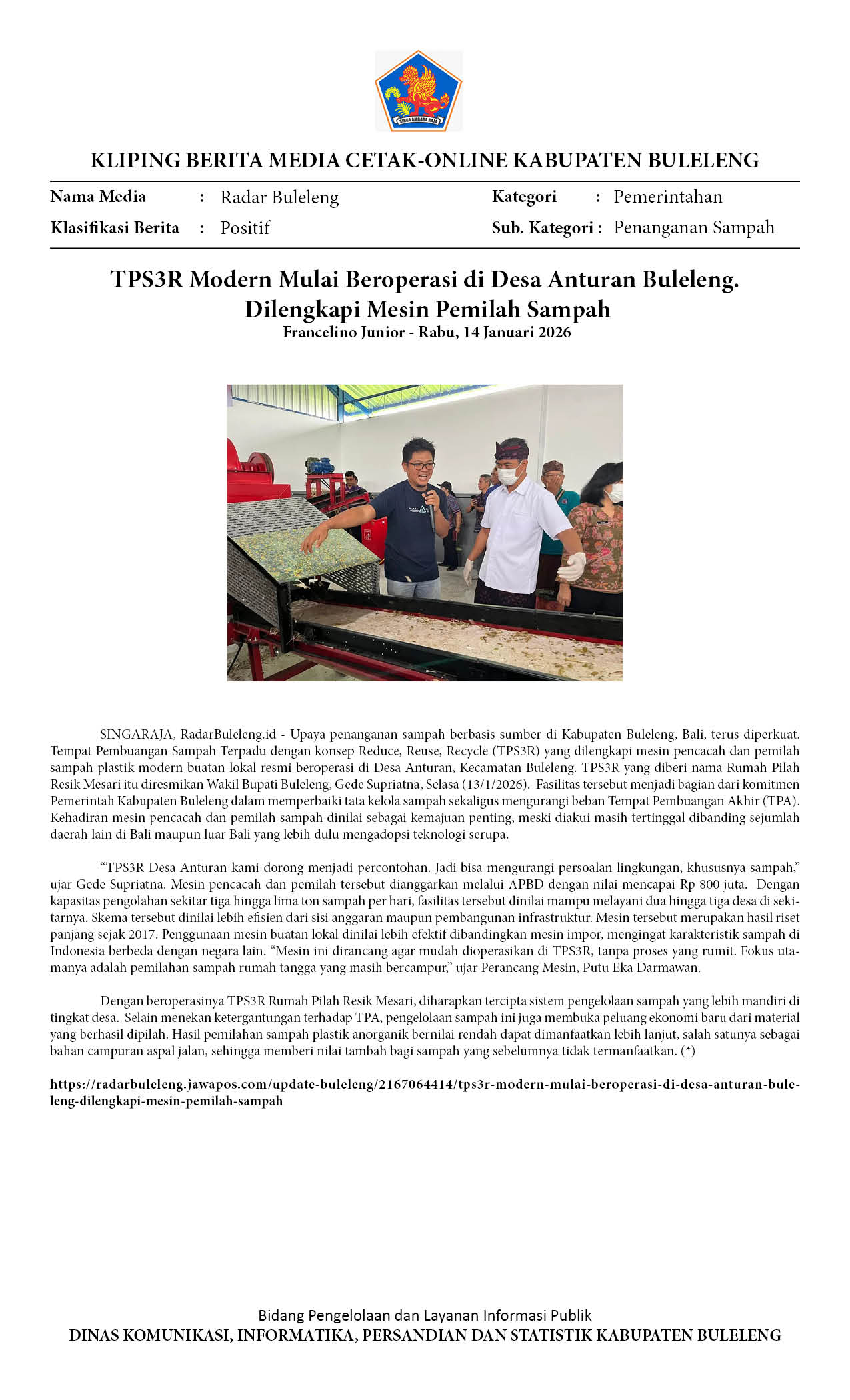 TPS3R MODERN MULAI BEROPERASI DI DESA ANTURAN BULELENG. DILENGKAPI MESIN PEMILAH SAMPAH