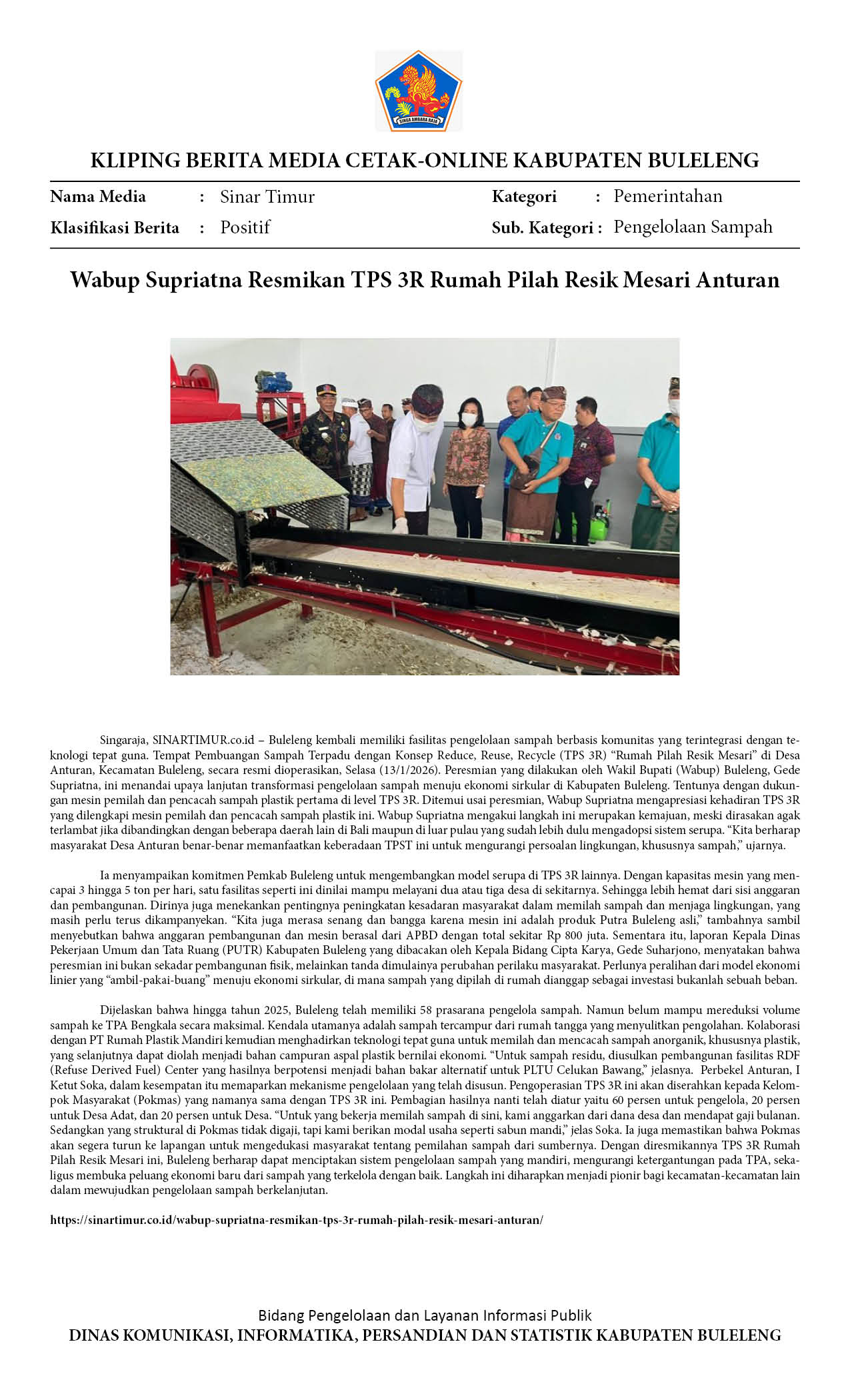 WABUP SUPRIATNA RESMIKAN TPS 3R RUMAH PILAH RESIK MESARI ANTURAN