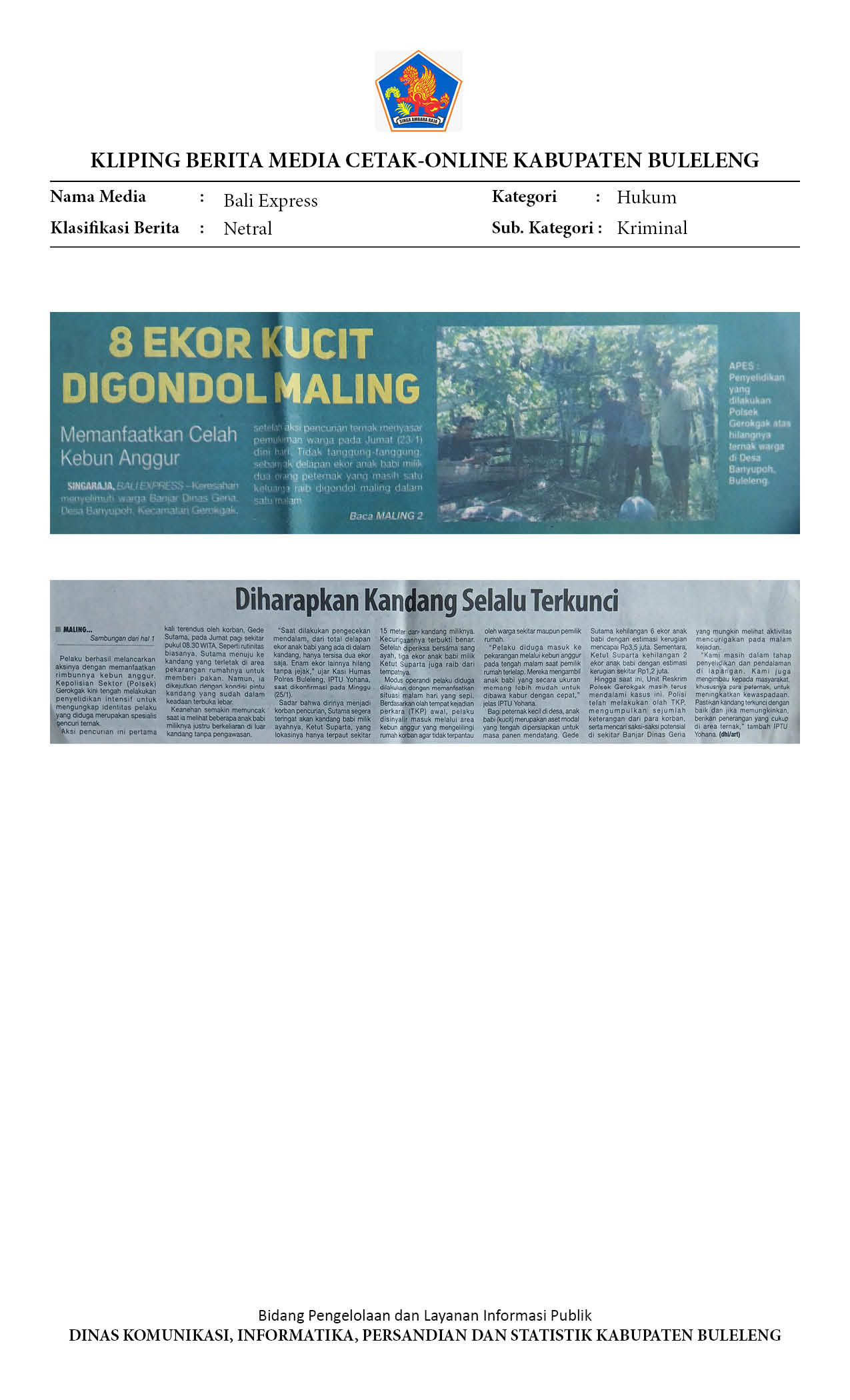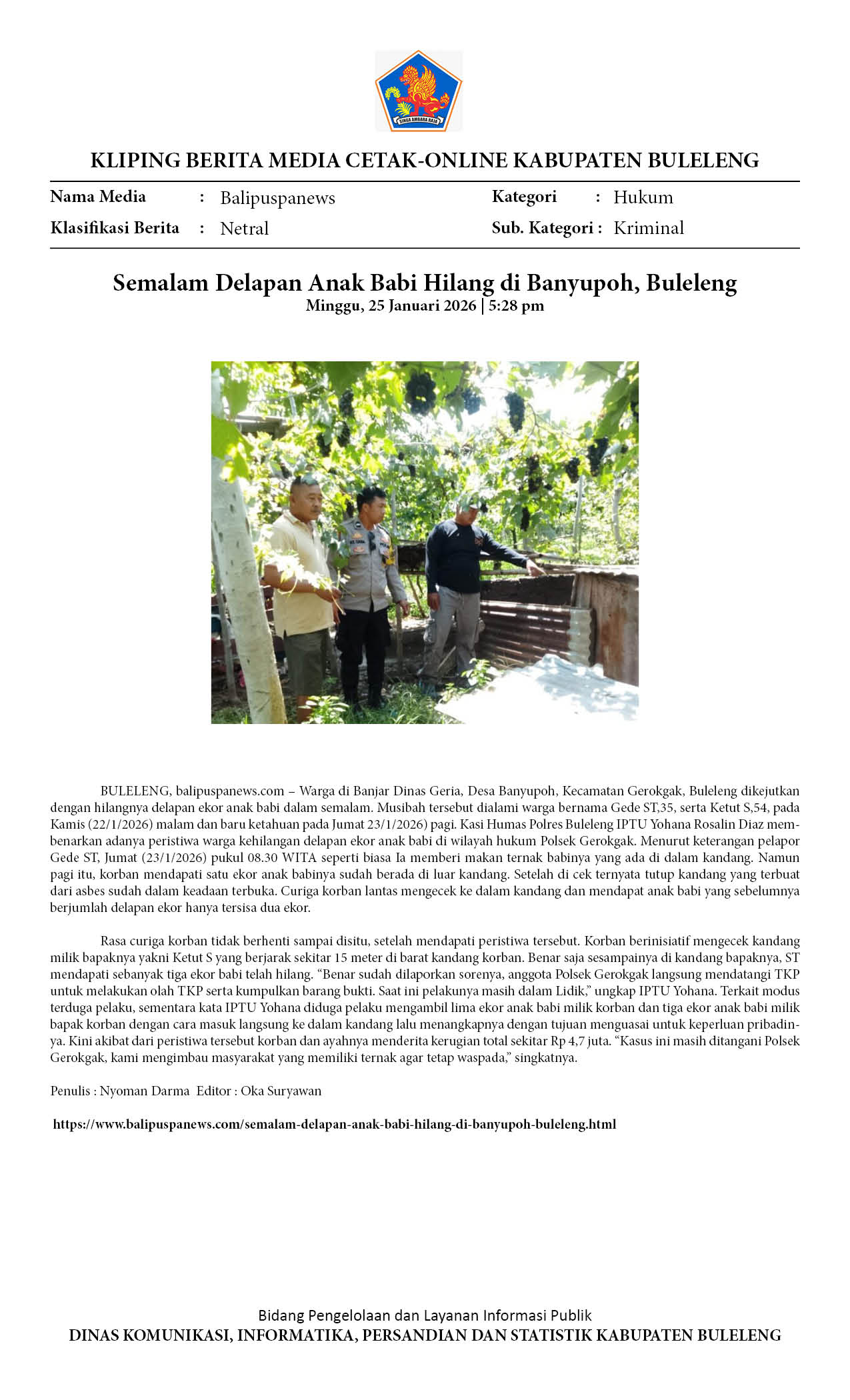 PENCURIAN ANAK BABI RESAHKAN WARGA BULELENG BALI, DELAPAN EKOR RAIB DALAM SEMALAM