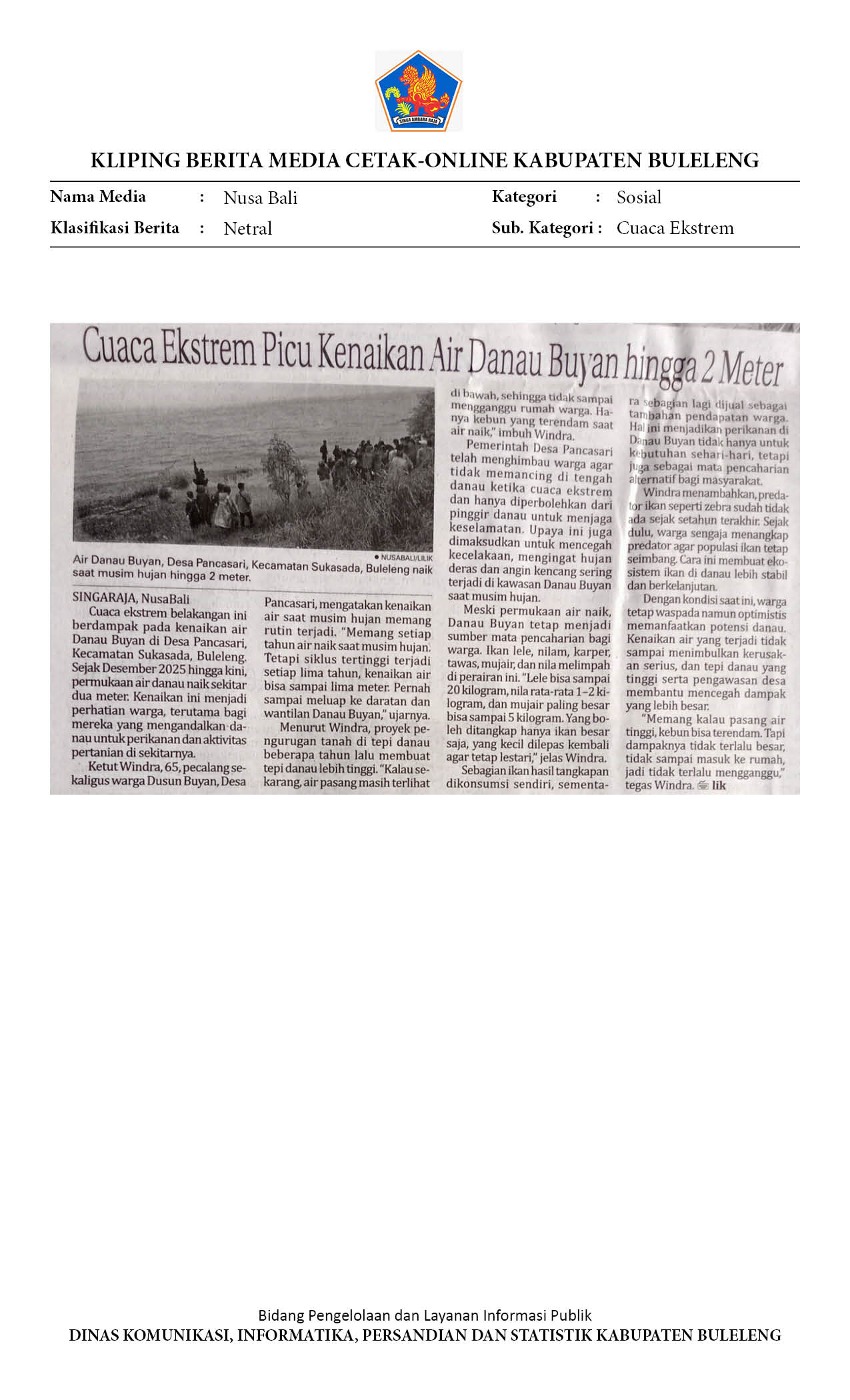 CUACA EKSTREM PICU KENAIKAN AIR DANAU BUYAN HINGGA2 METER