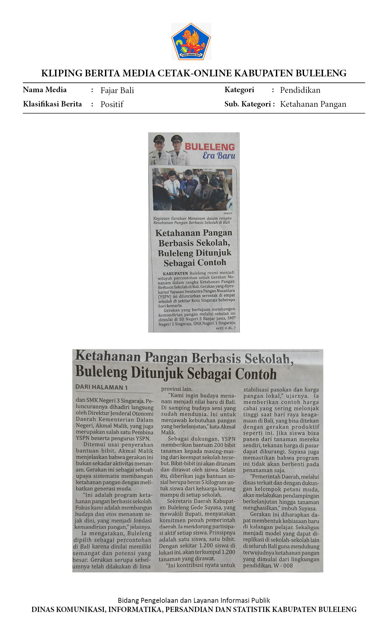 KETAHANAN PANGAN BERBASIS SEKOLAH, BULELENG DITUNJUK SEBAGAI CONTOH