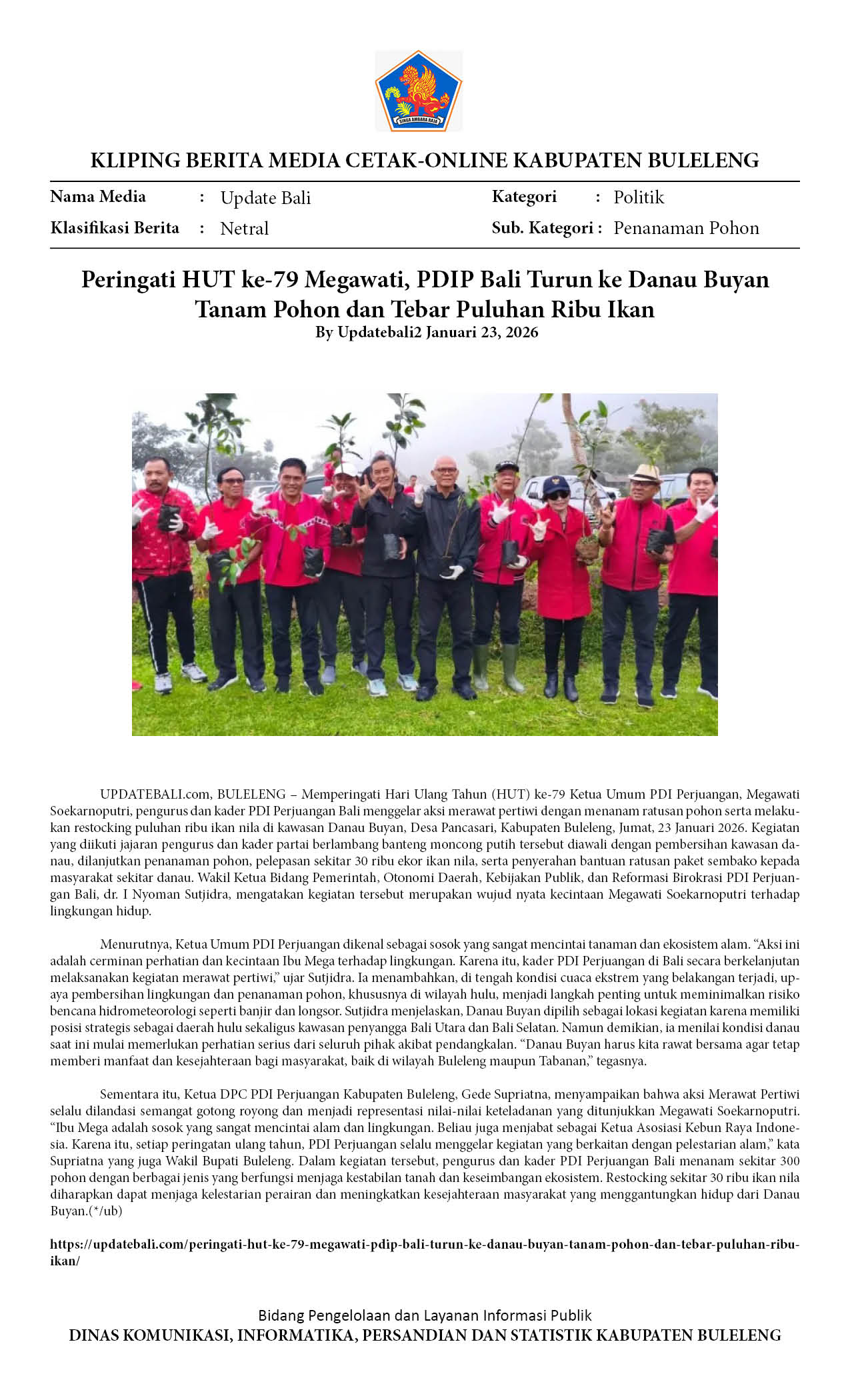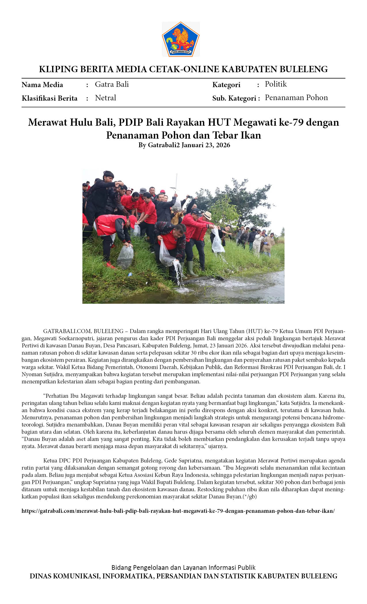 PERINGATI HUT KE-79 MEGAWATI, PDIP BALI TURUN KE DANAU BUYAN TANAM POHON DAN TEBAR PULUHAN RIBU IKAN