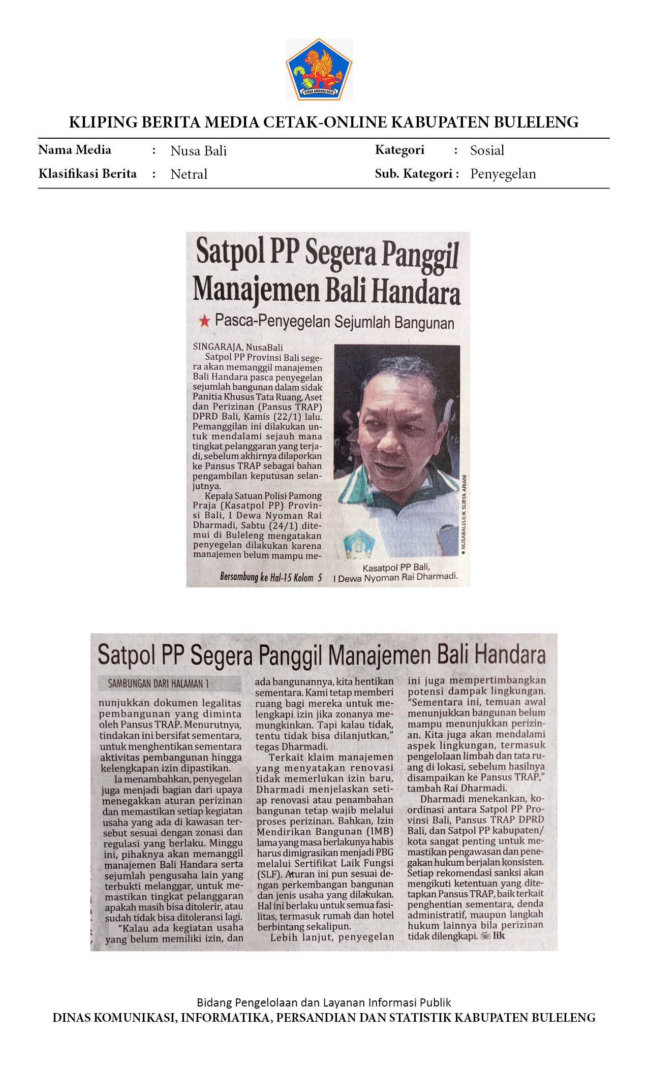 SATPOL PP SEGERA PANGGIL MANAJEMEN BALI HANDARA