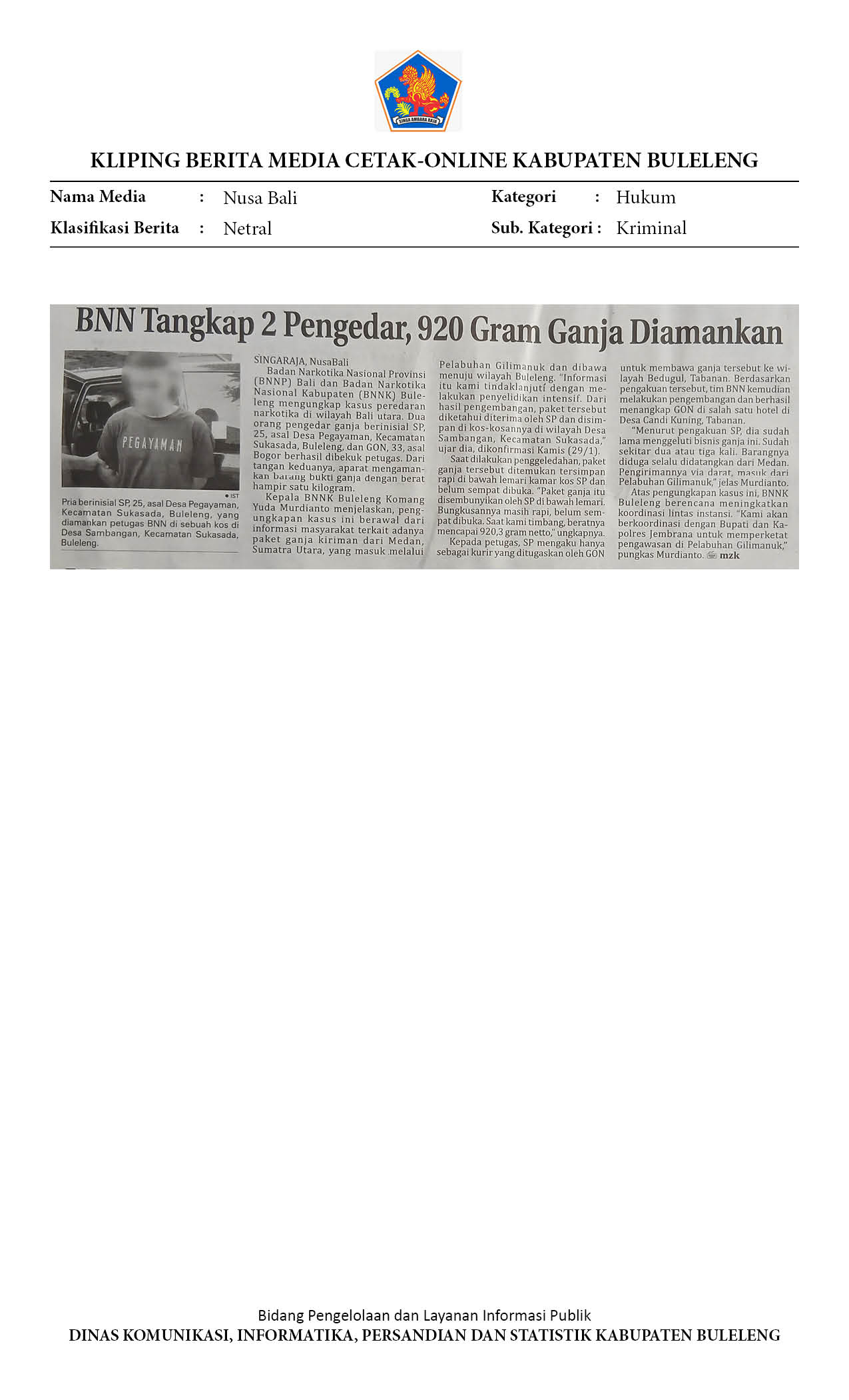 BNN TANGKAP 2 PENGEDAR, 920 GRAM GANJA DIAMANKAN
