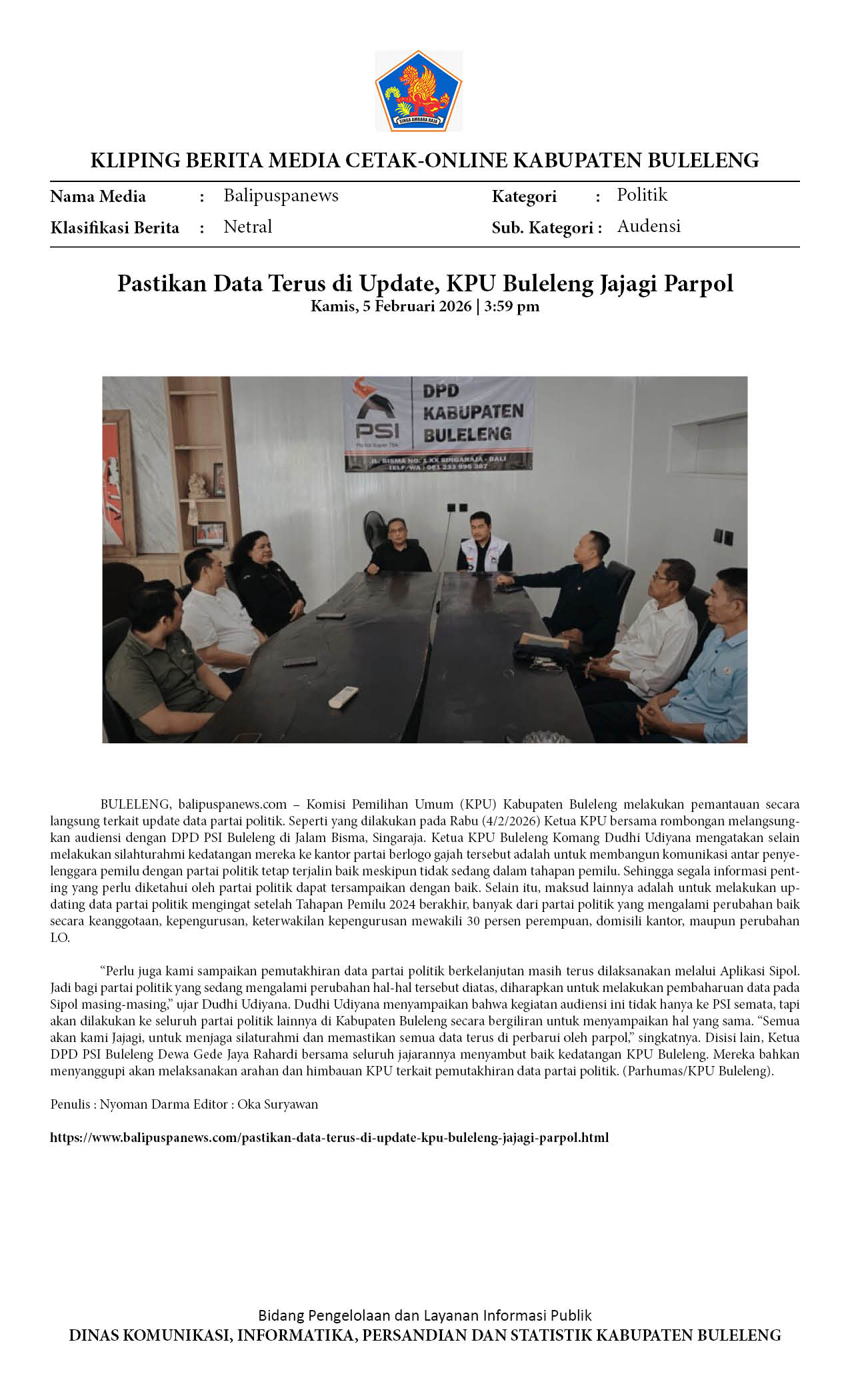 PEMBAHARUI DATA PARPOL, KPU BULELENG SAMBANGI KANTOR PSI