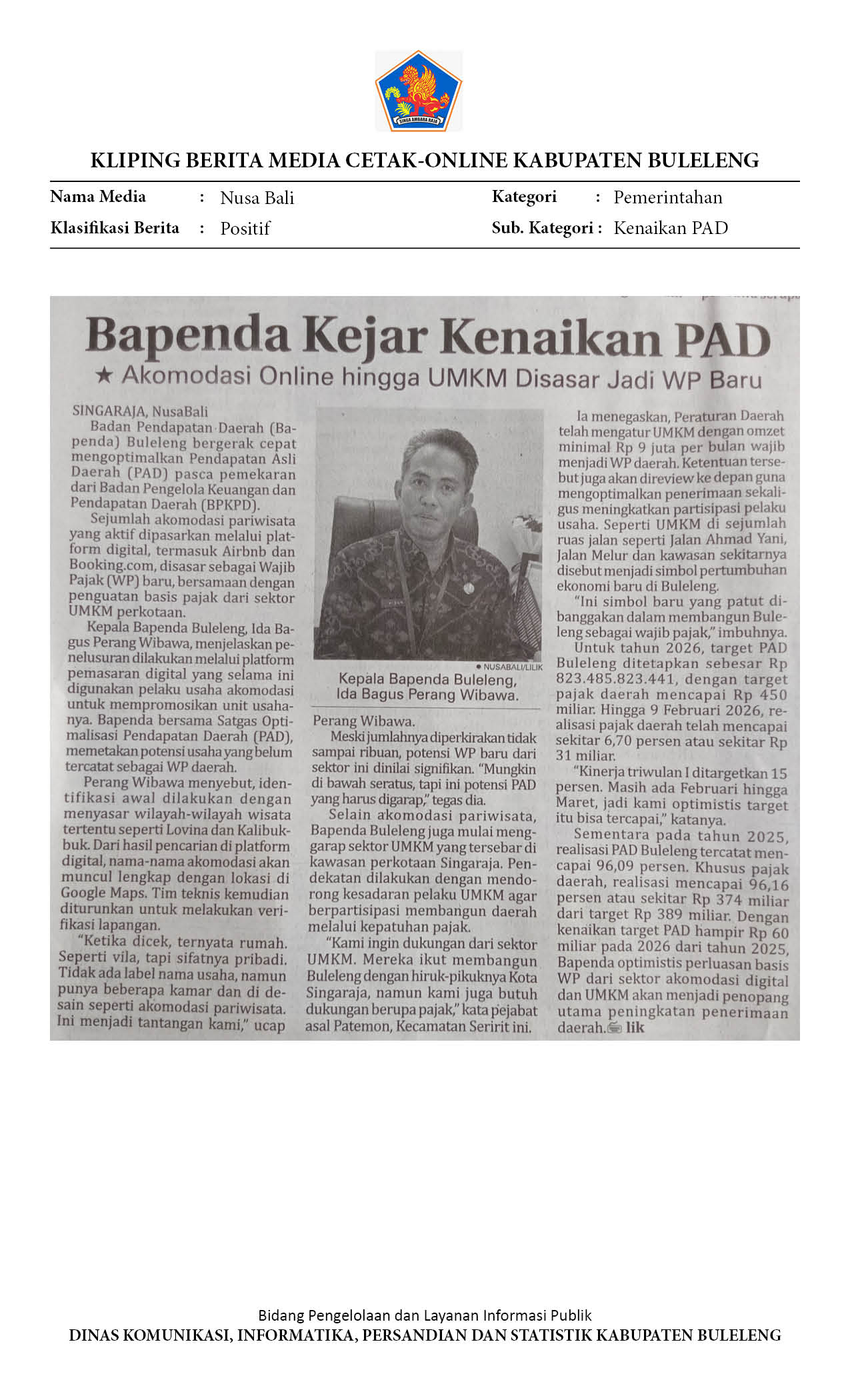 POTENSI AIRBNB HINGGA UMKM DIGARAP, PAD BULELENG DITARGET NAIK TAHUN 2026