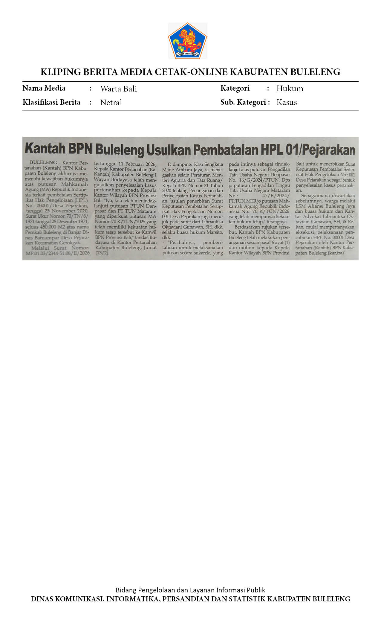 KANTAH BPN BULELENG USULKAN PEMBATALAN HPL 01/PEJARAKAN