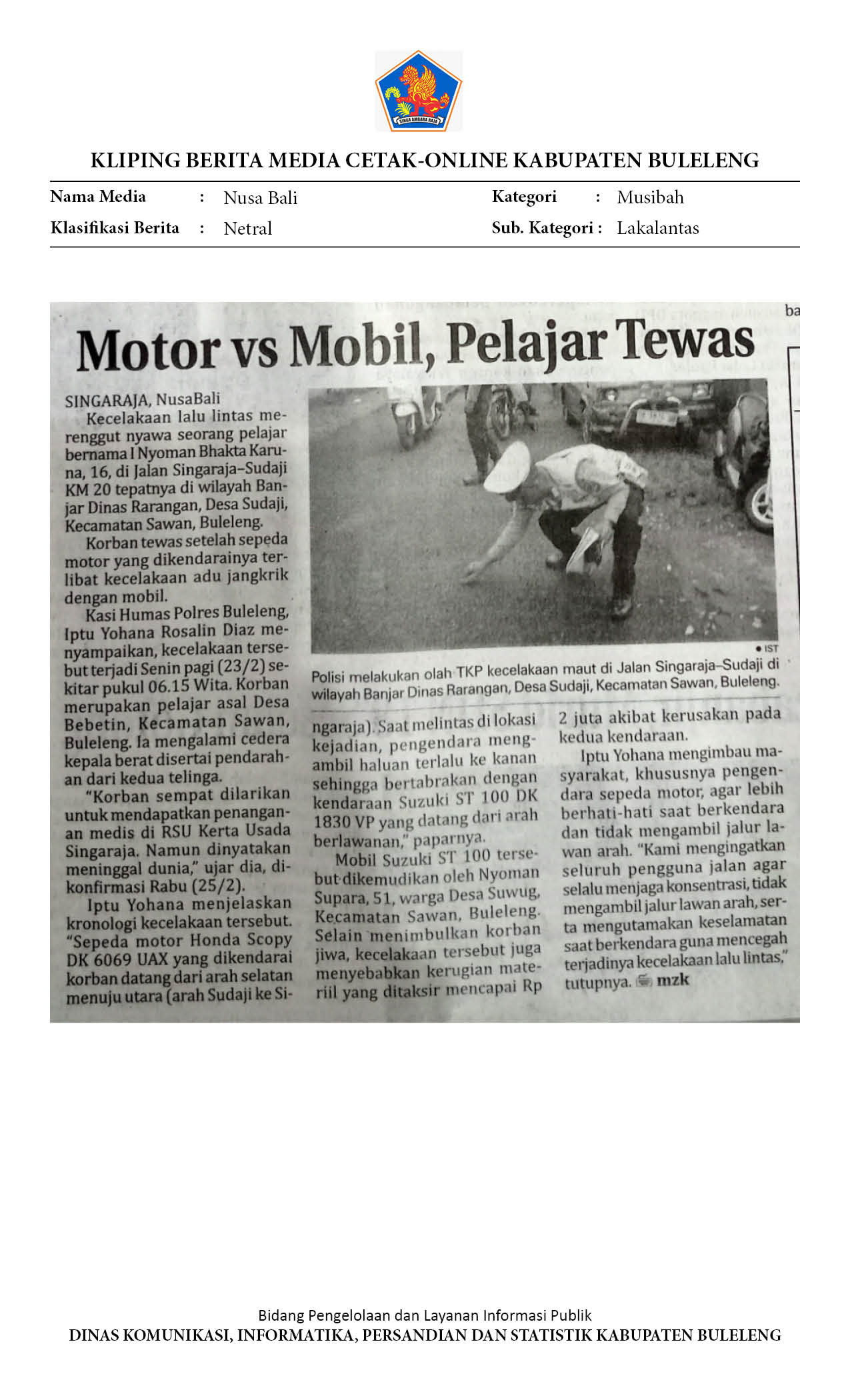 AMOR ING ACINTYA. PELAJAR TEWAS SETELAH TERLIBAT KECELAKAAN DI JALAN RAYA SINGARAJA-SUDAJI