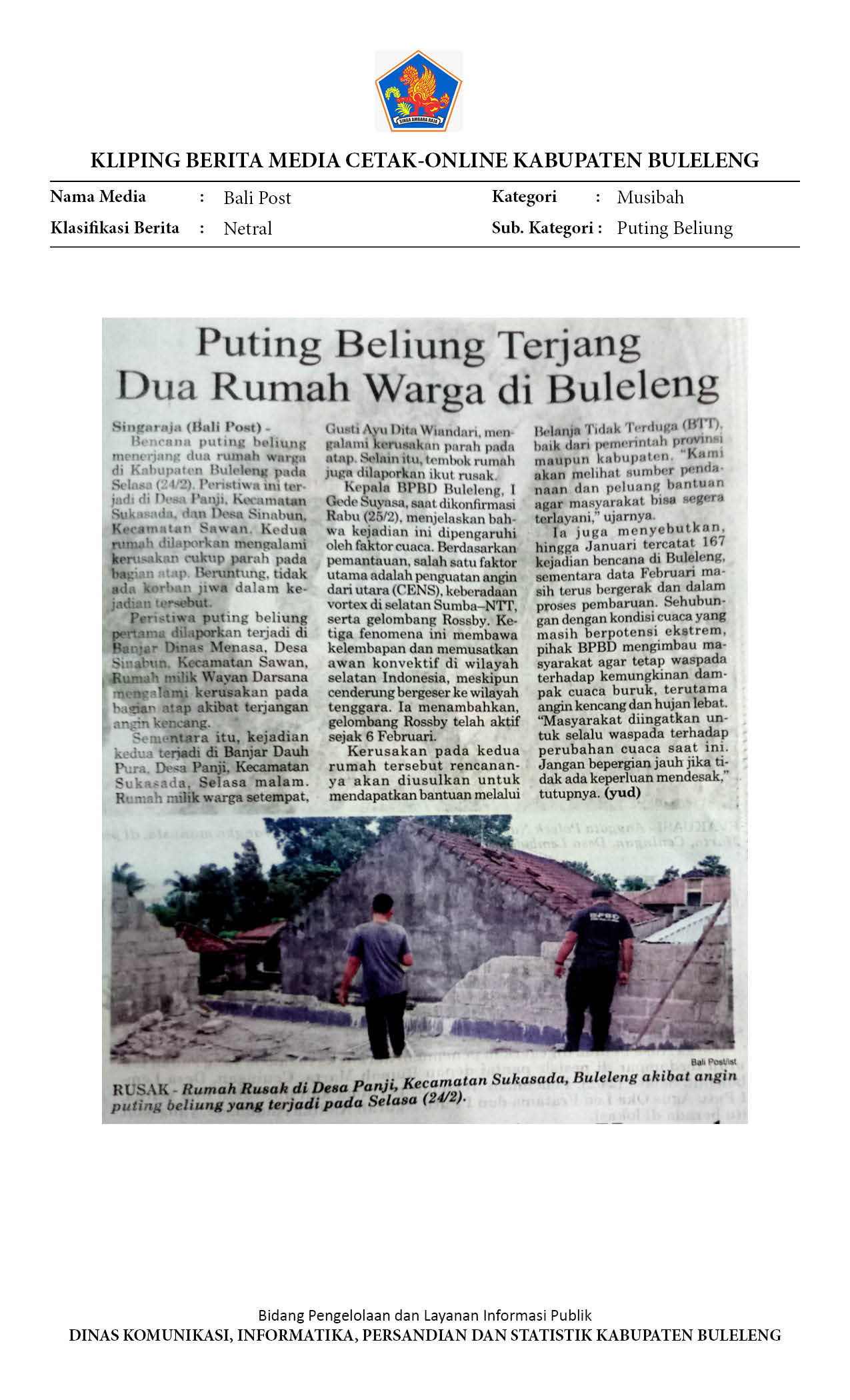 DUA RUMAH WARGA DI BULELENG RUSAK DITERJANG PUTING BELIUNG