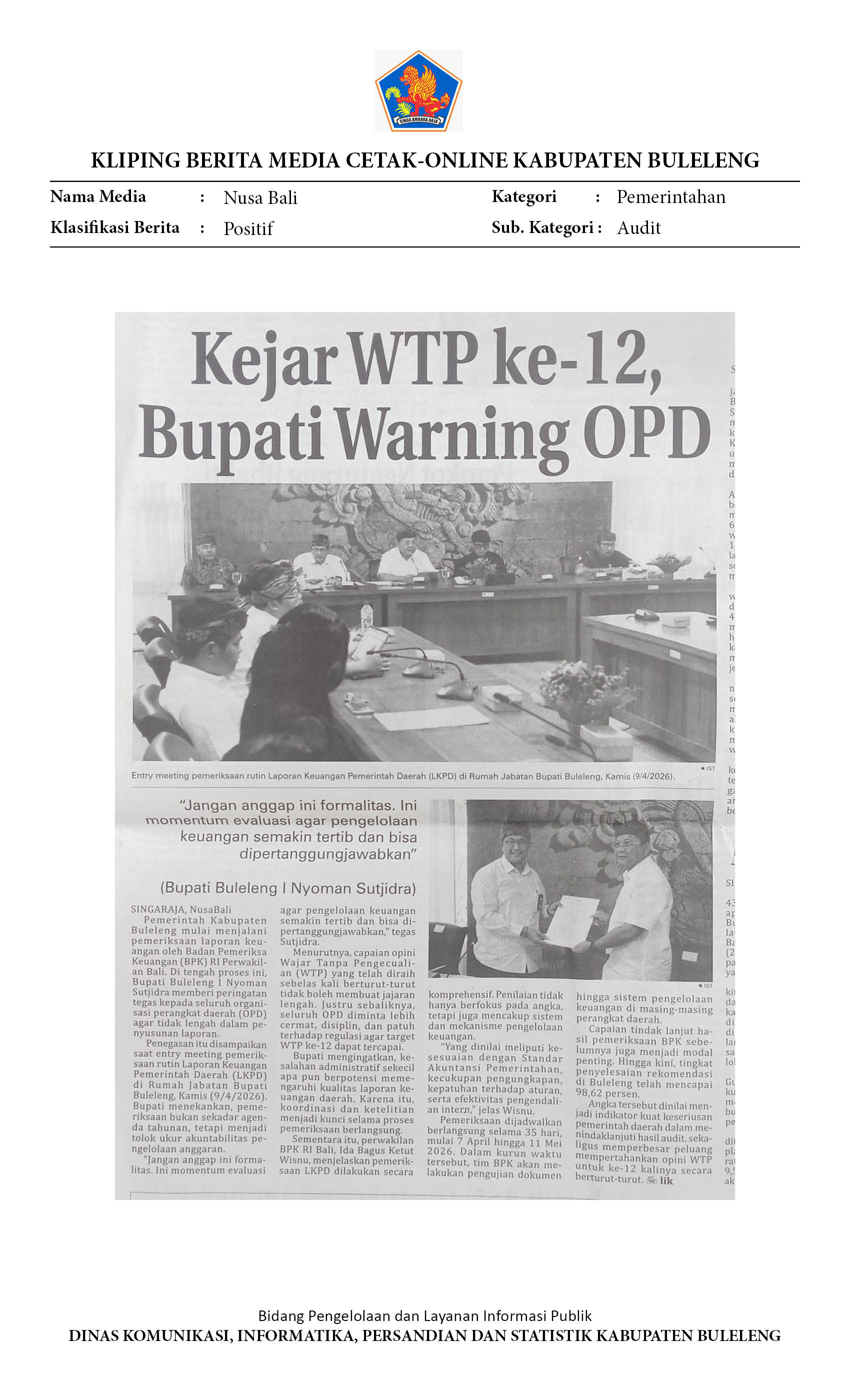 BUPATI BULELENG SUTJIDRA OPTIMIS PERTAHANKAN WTP UNTUK KE-12, PEMERIKSAAN KEUANGAN JADI MOMENTUM EVALUASI