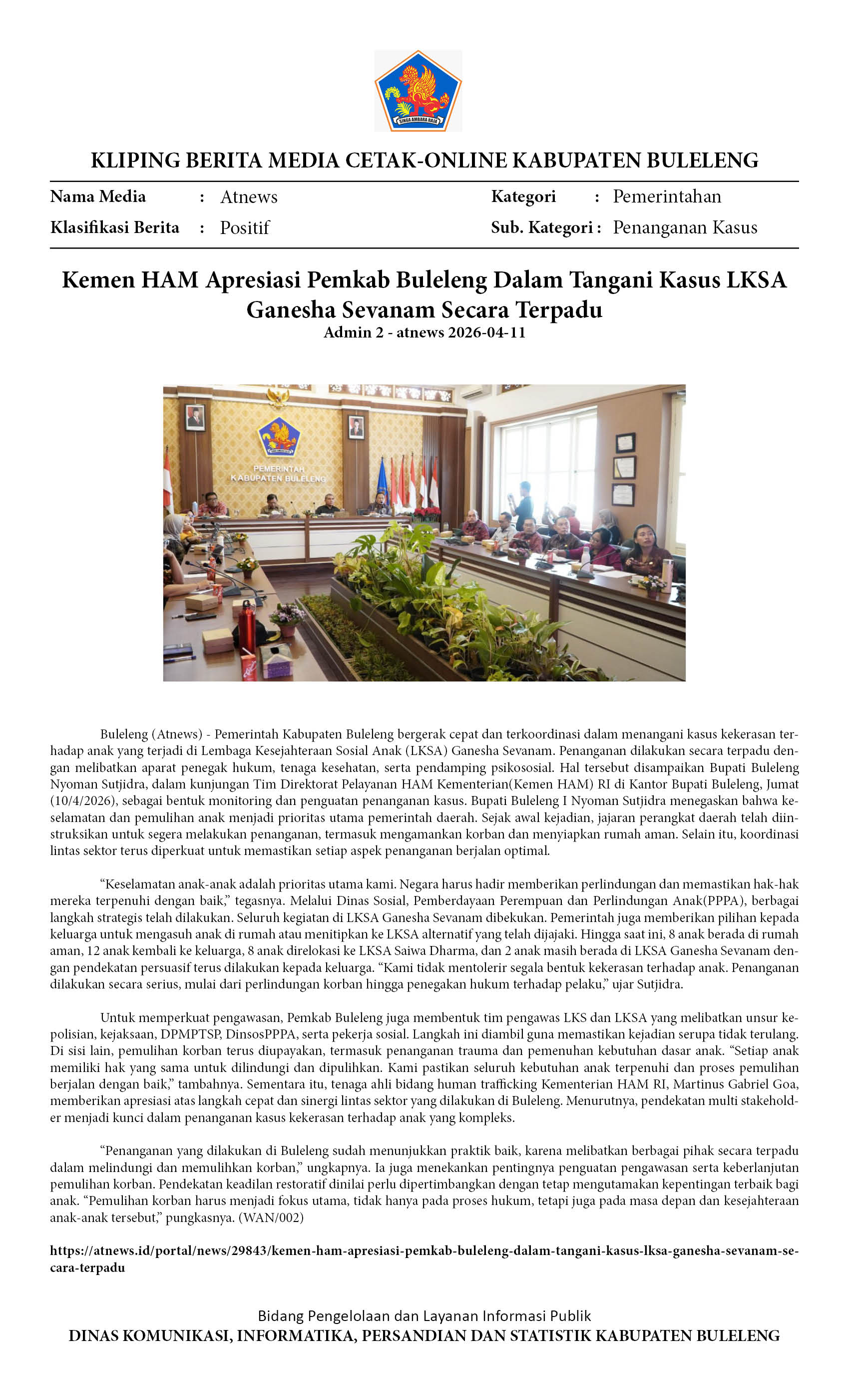 PEMKAB BULELENG DAPAT APRESIASI KEMENTERIAN HAM RI ATAS PENANGANAN CEPAT KASUS DI PANTI ASUHAN
