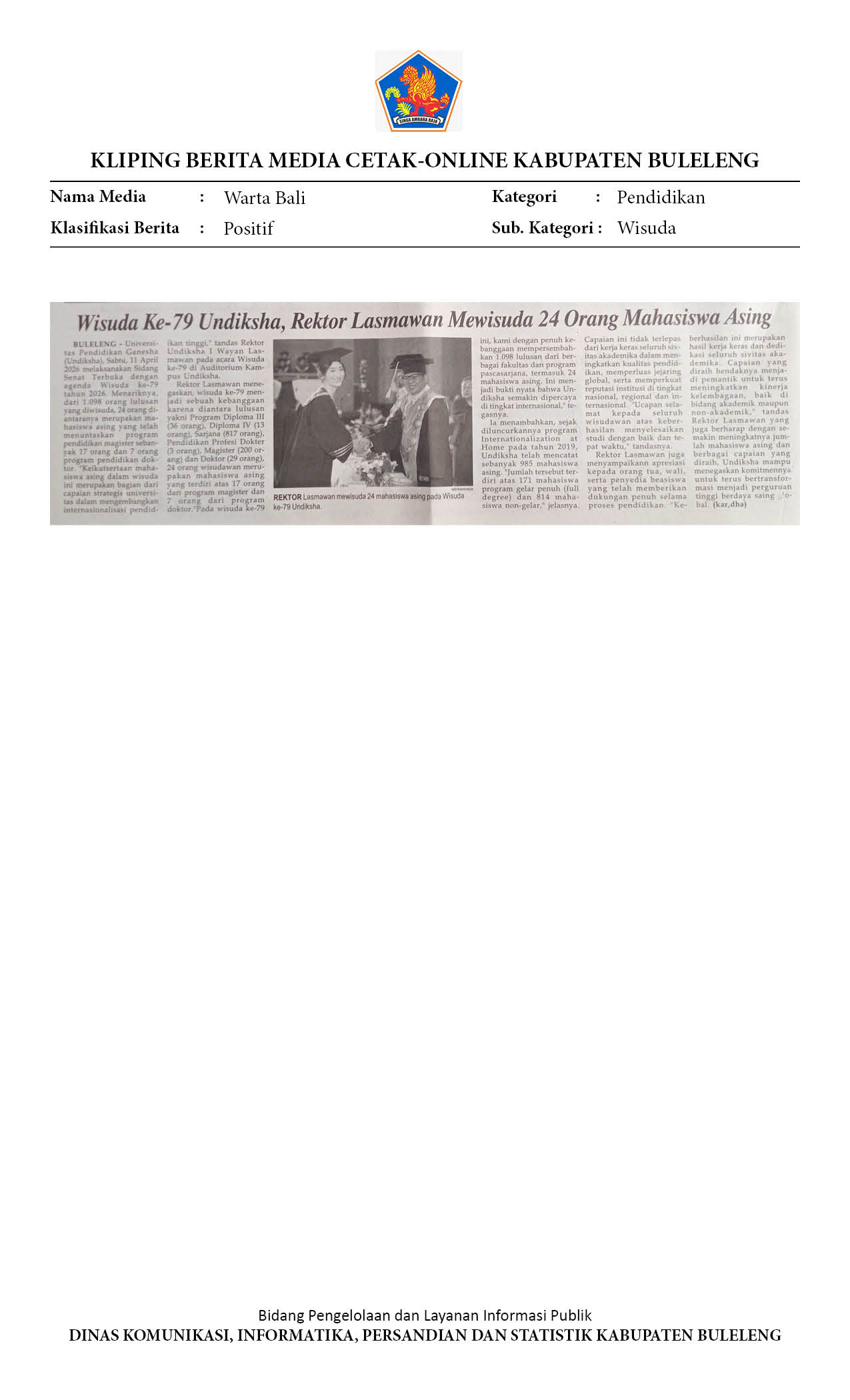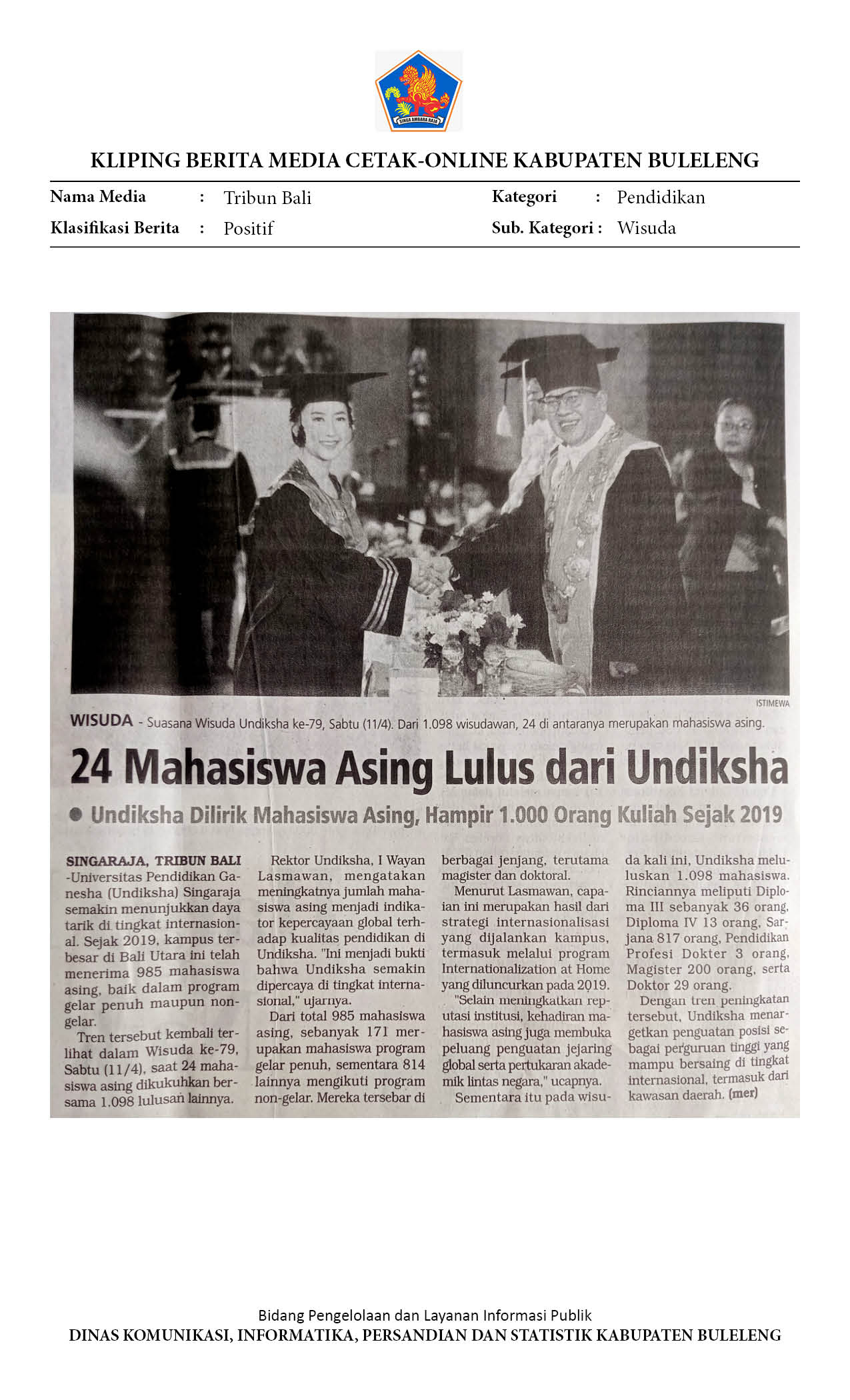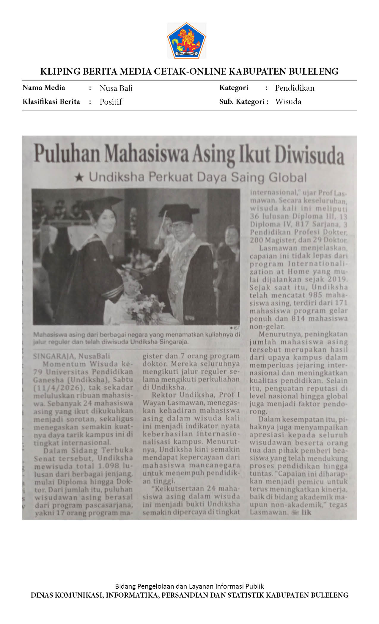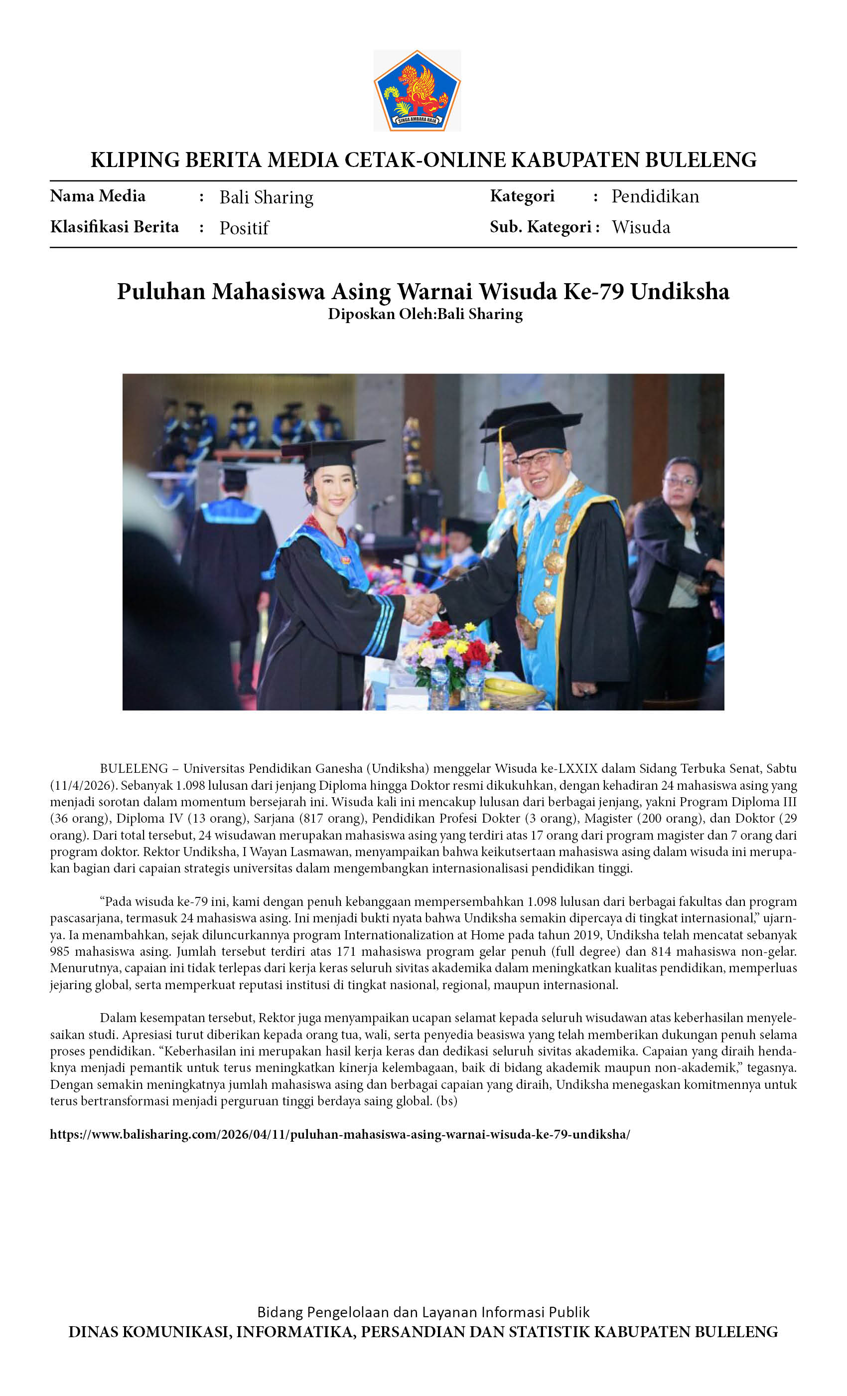 WISUDA KE-79 UNDIKSHA, REKTOR LASMAWAN MEWISUDA 24 ORANG MAHASISWA ASING